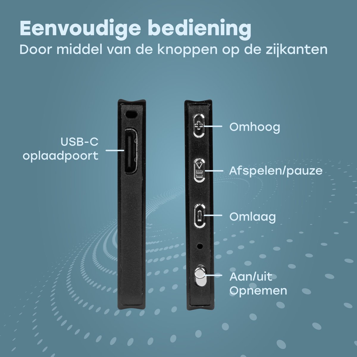 Met één druk op de knop start en stopt de recorder. Deze eenvoudige bediening zorgt dat je nooit een belangrijk gesproken moment mist en snel kunt reageren.