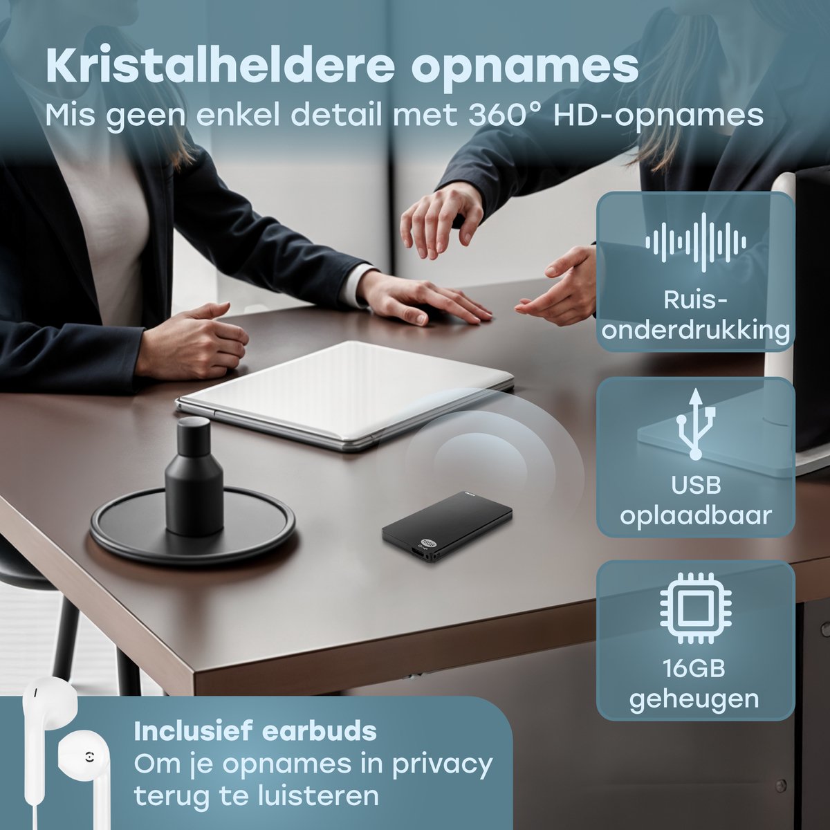 - Vergaderingen: plaats de recorder in het midden van de tafel voor optimale 360-gradendekking.