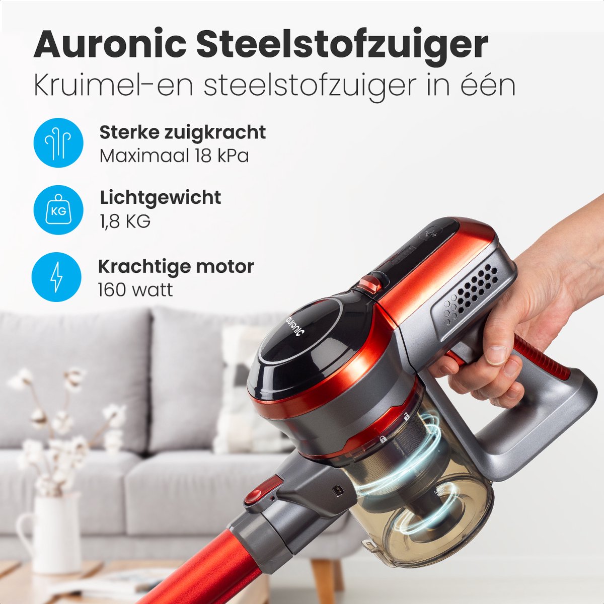 De Auronic fungeert als volwaardige steelstofzuiger én als handunit. Klik de steel los en gebruik de handunit voor de bank, vensterbank, keukentafel of de bekleding van de auto. In het dagelijks leven scheelt dat tijd: even snel door de hal na het binnenlopen met zand aan de schoenen, kruimels in de keuken na het ontbijt, of de kofferbak na een rit met de hond. De meegeleverde mondstukken helpen je om zowel nauwe kieren als grotere oppervlakken efficiënt aan te pakken.