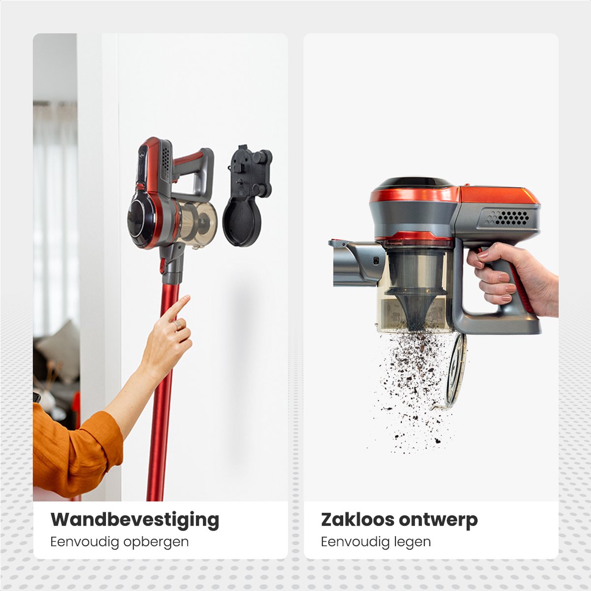 Doordat de stofzuiger eenvoudig aan de wand gevestigd kan worden, door de meegeleverde wandbevestiging, staat het netjes en neemt het ook geen extra plek op de vloer in.