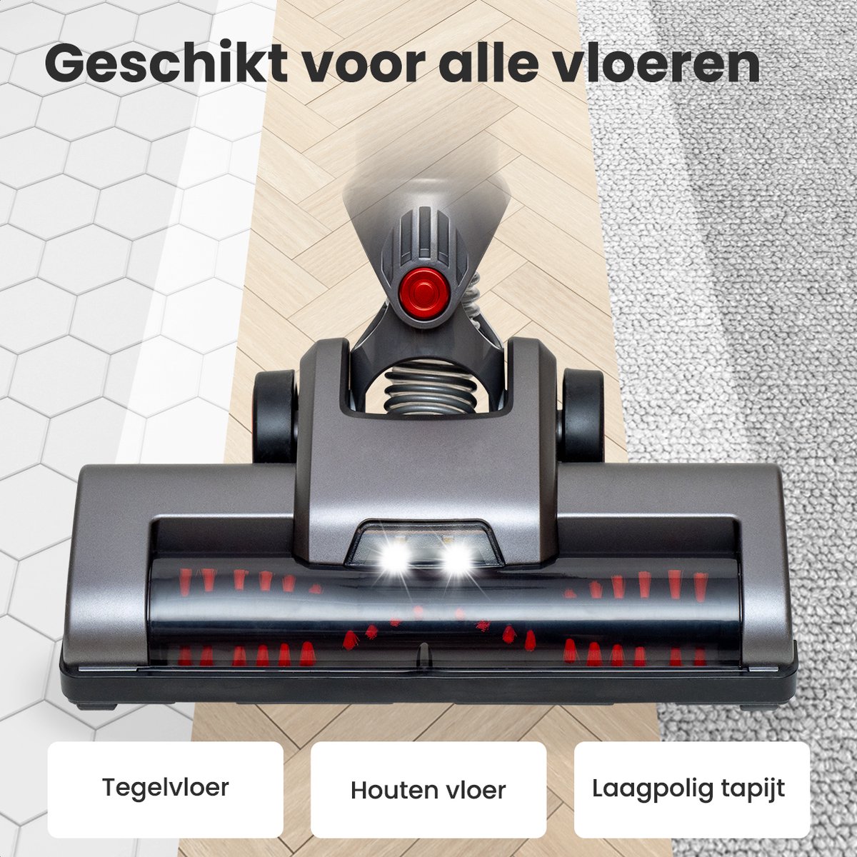 | 180° draaibare zuigmond komt makkelijk onder meubels | Geen informatie over een gemotoriseerde vloerrol; prestaties op tapijt daardoor beperkt |