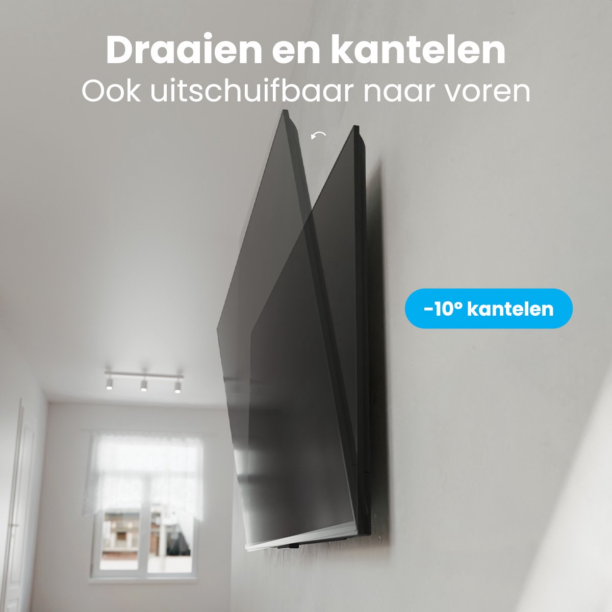 Een beperkte kantelfunctie van 10° maakt het mogelijk om de kijkhoek iets te corrigeren als de TV hoger dan ooghoogte is geplaatst. Dit vermindert nekbelasting en reflecties, zeker bij felle ruiten of plafondverlichting.