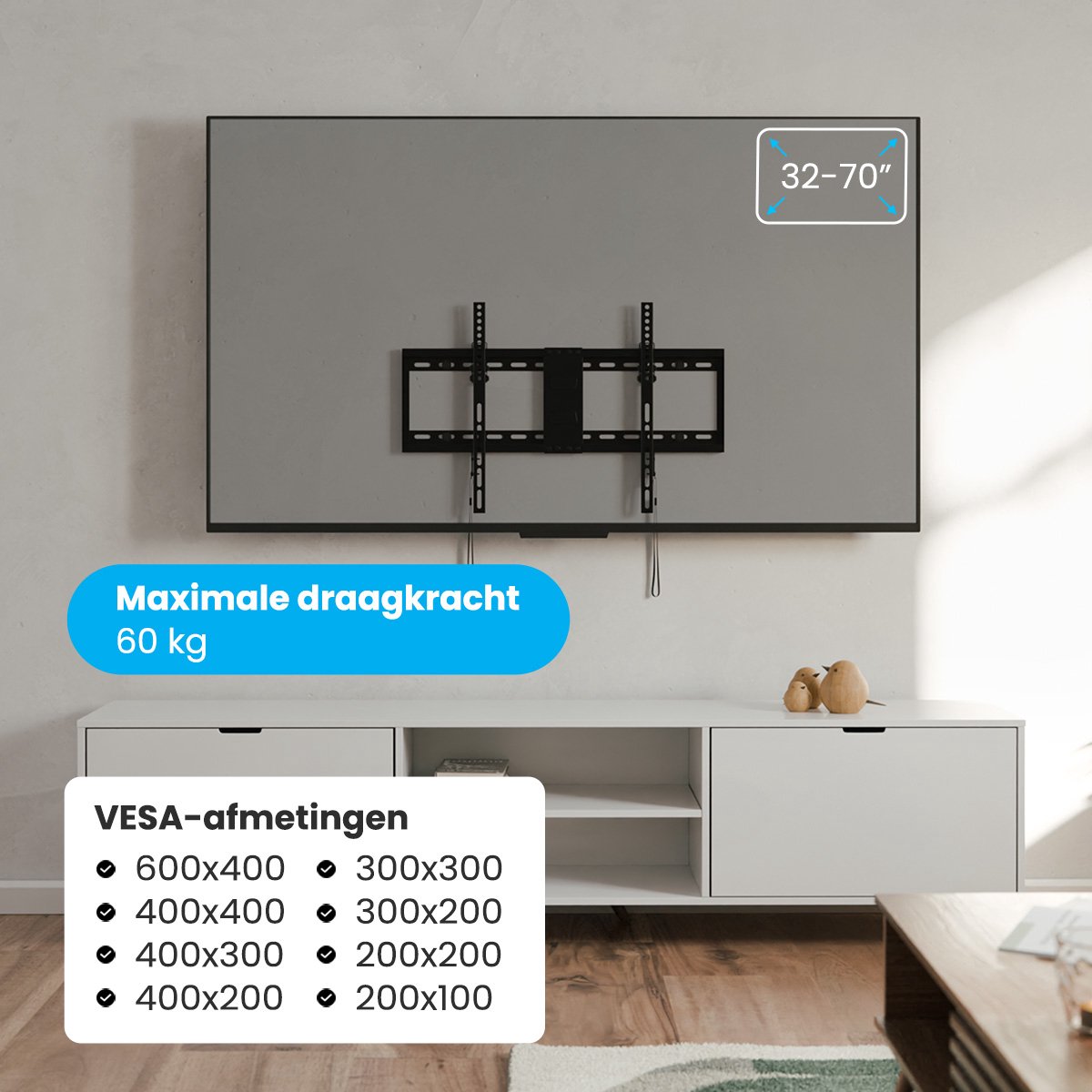 - Je bezit een televisie van 32” tot 70” met een van de ondersteunde VESA-formaten en tot 60 kg gewicht.