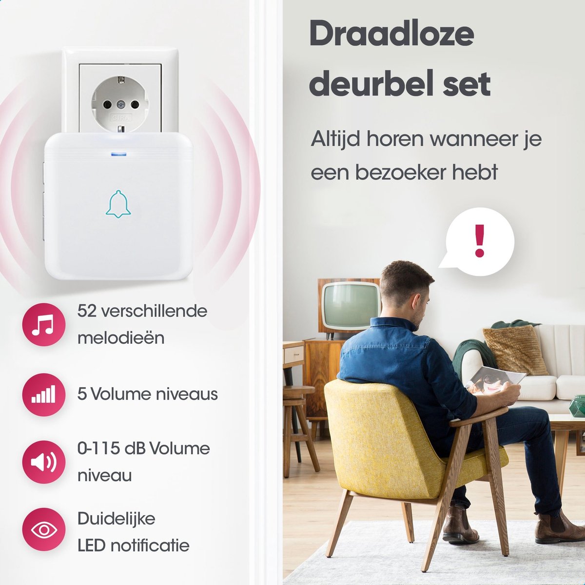 Zoek je specifiek een waterdichte deurbel die zonder gedoe werkt, een deurbel met 2 ontvangers voor goede dekking, een deurbel met groot bereik, een IP55 deurbel, een deurbel met 52 melodieën en zelfs een deurbel voor slechthorenden? Dan past dit pakket precies bij die wensen.