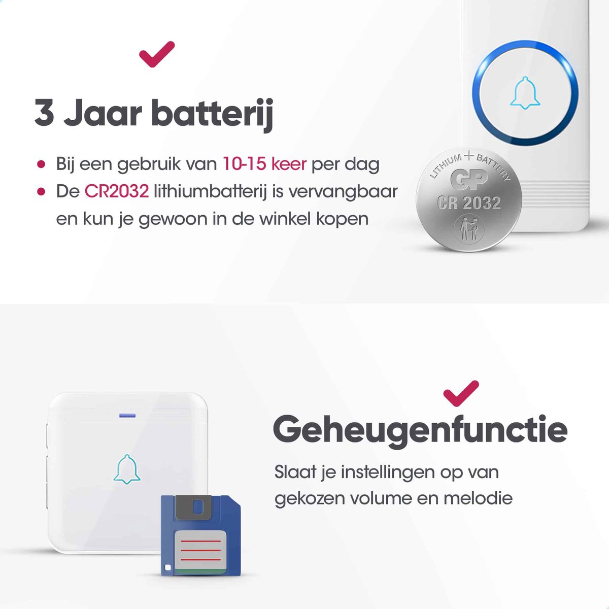 De twee ontvangers gaan rechtstreeks in het stopcontact en hebben geen losse adapter of batterijen nodig. De zender werkt op een CR2032-knoopcel. Volgens de fabrikant/verkoper gaat die batterij ongeveer 3 jaar mee bij 10–15 belmomenten per dag. Dat is voor de meeste huishoudens ruimschoots voldoende.