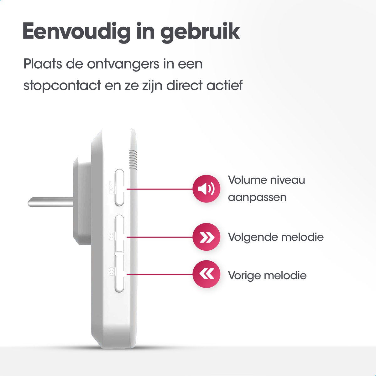 Haal je een ontvanger uit het stopcontact, dan onthoudt hij de laatst gekozen melodie en het volume. Dat is ideaal als je bijvoorbeeld een stopcontact tijdelijk nodig hebt voor een stofzuiger of gereedschap. Je steekt de ontvanger daarna terug en alles staat zoals jij het had ingesteld. Je hoeft dus niet telkens je favoriete instellingen op te zoeken.