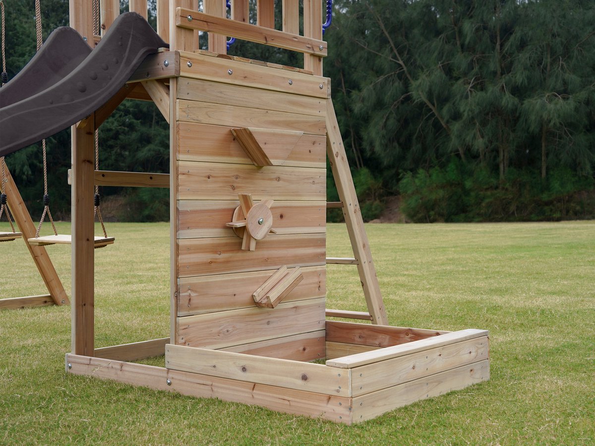 Aan de voet van de toren zit een zandbak met een speelwand waarop kinderen zand kunnen gieten, draaien aan een rad en zandtaartjes maken. De speelwand en zandbak zijn overdekt met een luifel, waardoor zandspelen ook bij lichte regen of in de felle zon aangenamer is. De zandbak is geschikt voor ongeveer 125 kg zand (bron: listing, checked 2025), wat voldoende is voor meerdere kinderen tegelijk.