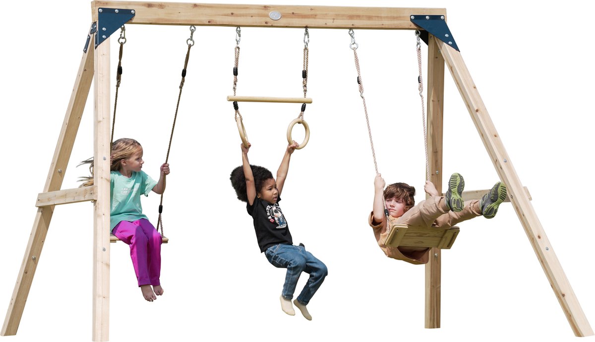 De AXI Maya is uitgerust met twee in hoogte verstelbare houten zitjes. That betekent kinderen kunnen tegelijk schommelen en elkaar gezelschap houden. Dit stimuleert samenspel en zorgt ervoor dat broers, zussen of vriendjes samen kunnen bewegen en turnen. De verstelbare hoogte maakt het geschikt voor een range van leeftijden (3–10 jaar) en vergroot de bruikbaarheid naarmate kinderen groeien.