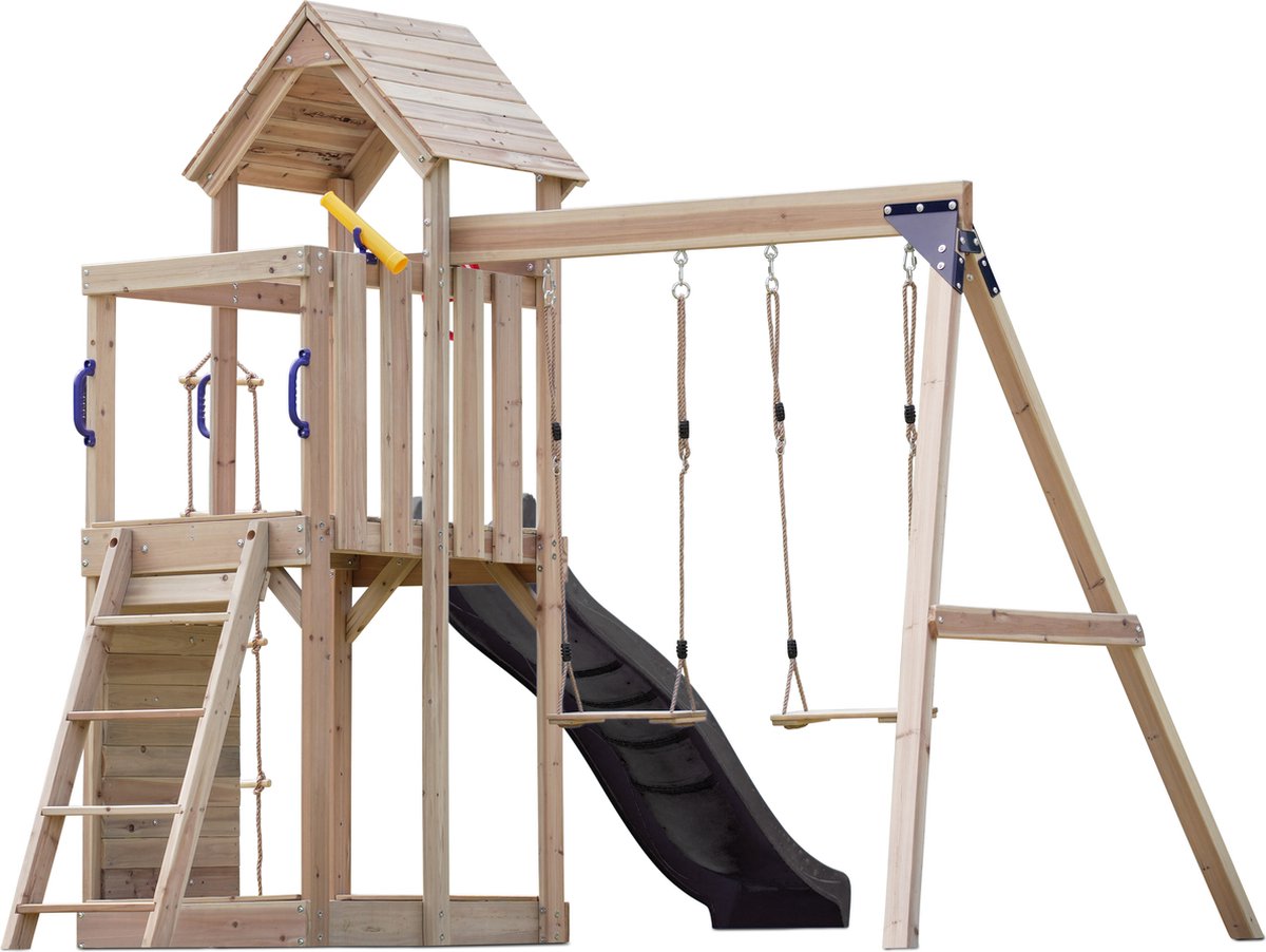 Veel speelopties (glijbaan, dubbele schommel, klimwand, touwladder, zandbak) | Montage vergt tijd en minimaal twee volwassenen |