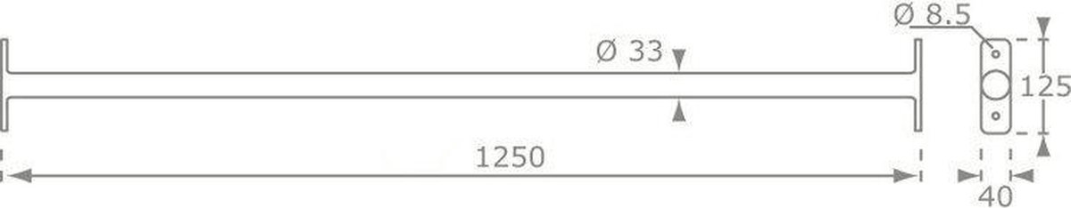 - Onderhoud: omdat materiaal en coating niet zijn vermeld, behandel de stang als volgt: houd hem schoon en droog, controleer op roest of slijtage als hij buiten is geplaatst, en smeer bewegende onderdelen (indien aanwezig) licht in met een geschikt middel volgens fabricanteradvies (niet gespecificeerd).