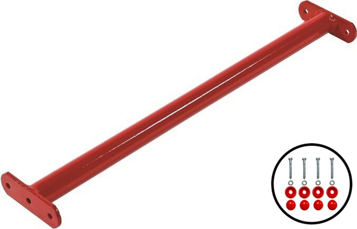 De stang is gemaakt van staal en afgewerkt met een poedercoating in rood. Dit betekent dat het materiaal robuust is en goed bestand tegen de normale belasting van kinderen die eraan hangen of draaien. In de praktijk betekent dit minder kans op vervorming of breuk bij normaal gebruik in de tuin en een lagere kans op roestvorming zolang losse lakplekken worden bijgewerkt.