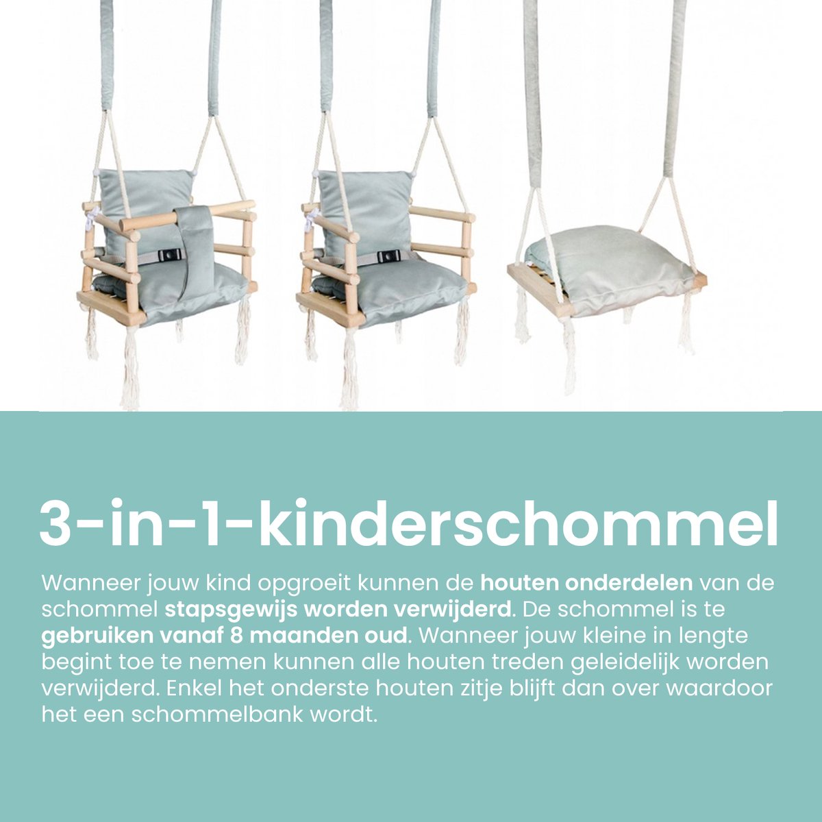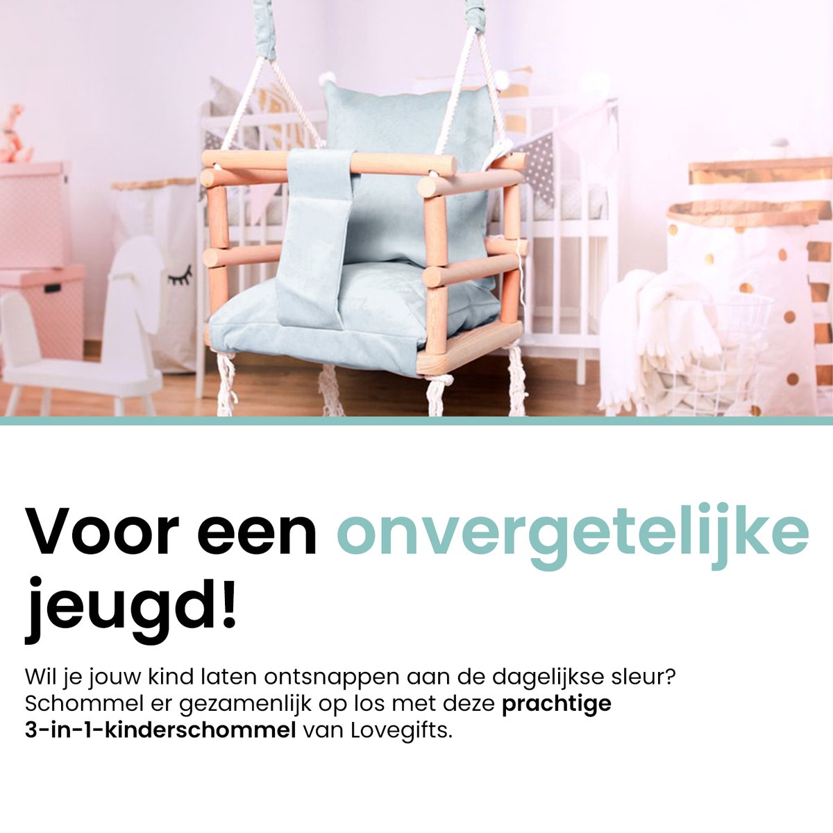 De 3-in-1 kinderschommel van Lovegifts is een veelzijdige schommel voor jonge kinderen: luxe afgewerkt, verstelbaar en ontworpen om mee te groeien van baby naar peuter. Het gaat om een compacte, lichtgewicht schommel met zachte bekleding van hetmerk CLEANABOO® en een houten frame dat in meerdere stappen kan worden aangepast.