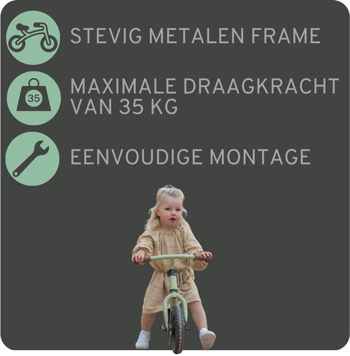 Het metalen frame is het fundament van deze loopfiets. Voordeel: het biedt stabiliteit tijdens het rijden en is doorgaans minder gevoelig voor beschadiging door stoten. In de praktijk betekent dit dat de fiets langere tijd gebruikt kan worden door meerdere kinderen of bij intensiever buitengebruik zonder dat het frame snel verslechtert. Nadelen van metaal (zoals mogelijk gewicht of kans op roest bij slecht onderhoud) worden in de listing niet expliciet genoemd, dus let bij langdurig buiten laten wel op bescherming tegen vocht.