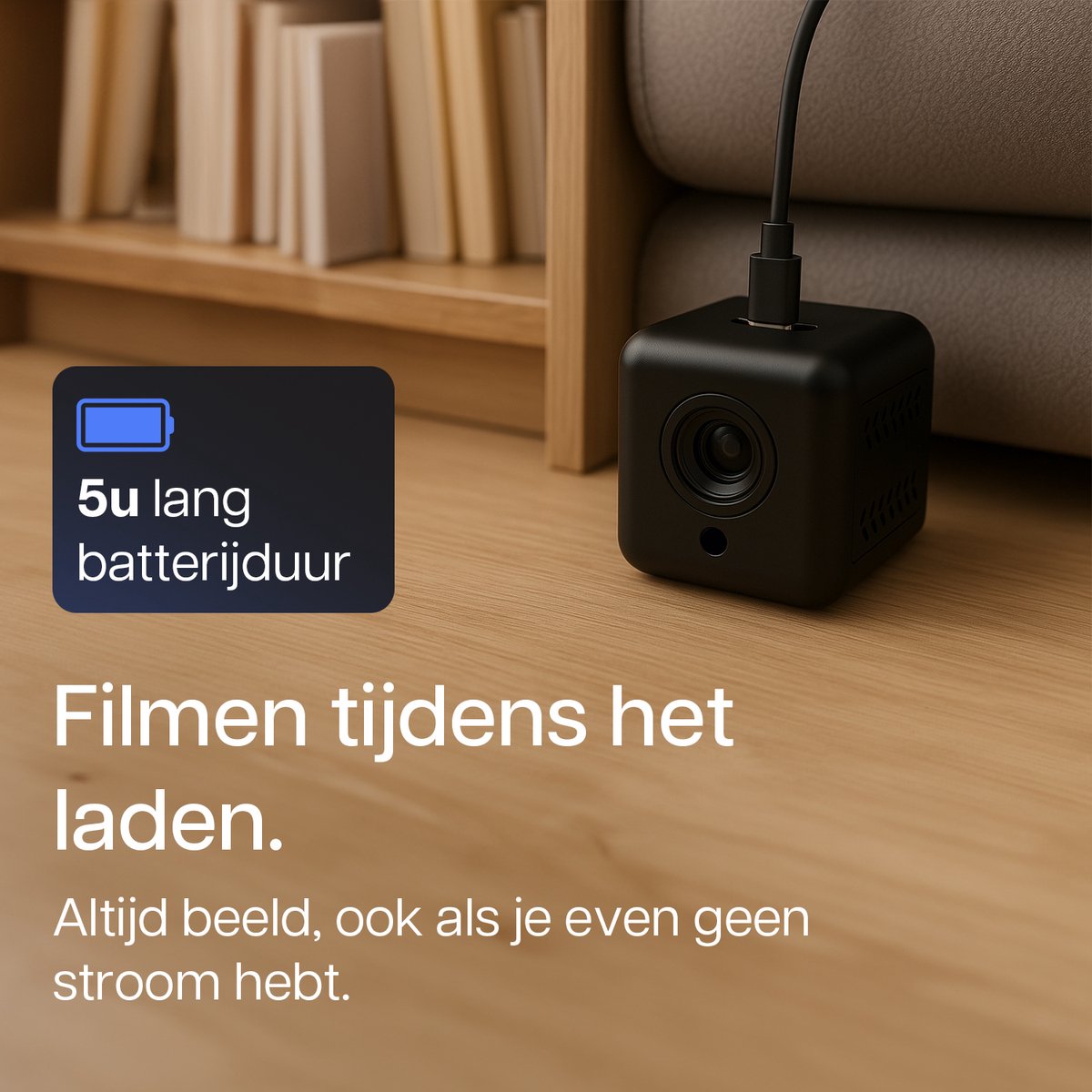 • De opgegeven batterijduur is ongeveer 4–5 uur afhankelijk van gebruik (source: listing, checked 2025). Voor continue opname is aansluiten op netstroom aanbevolen; de camera laadt in circa 5–6 uur op met een 1A adapter.
