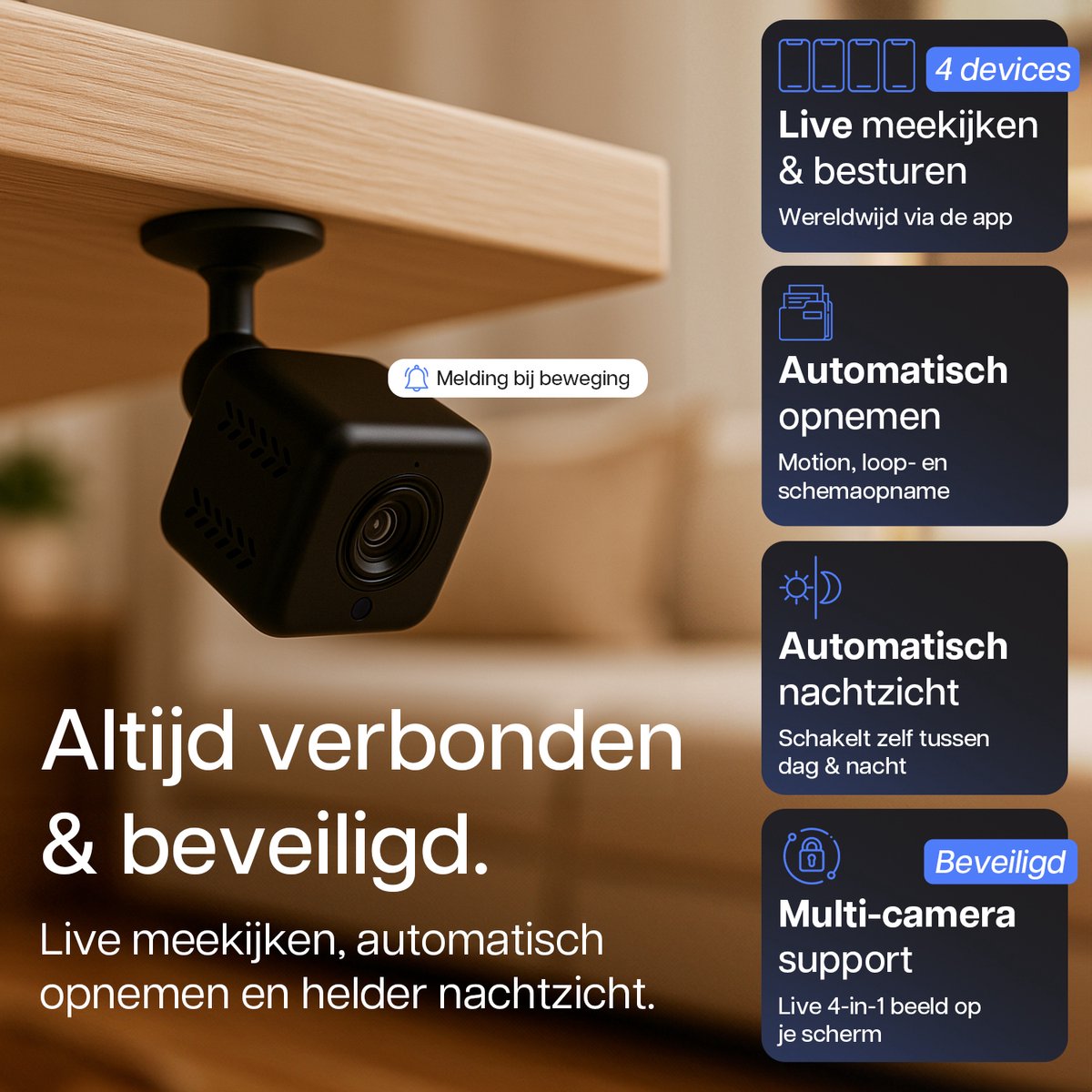 De Bastix® X4 Mini is een compacte, slimme mini bewakingscamera die bedoeld is voor wie discrete bewaking wil zonder ingewikkelde installatie. Dit toestel combineert nachtzicht, bewegingsdetectie en app-gestuurde bediening in een handzaam formaat dat je vrijwel overal kunt plaatsen.