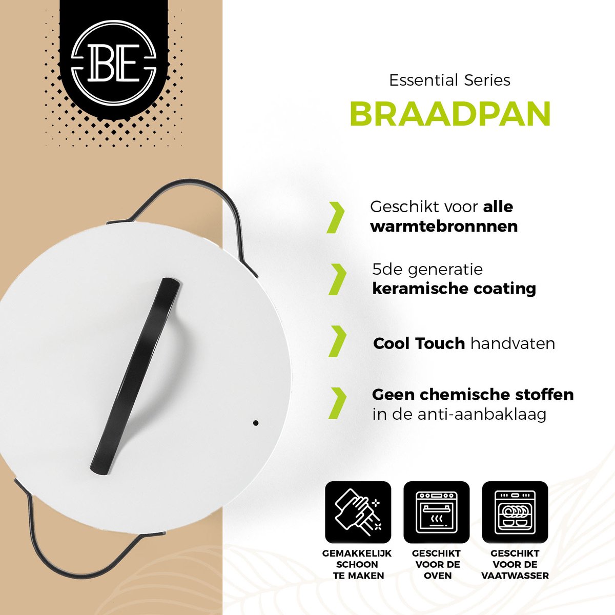 Als je op zoek bent naar een moderne, PFAS-vrije keramische pan voor dagelijks koken en een nette uitstraling belangrijk vindt, is deze BE Living kookpan een goede keuze.