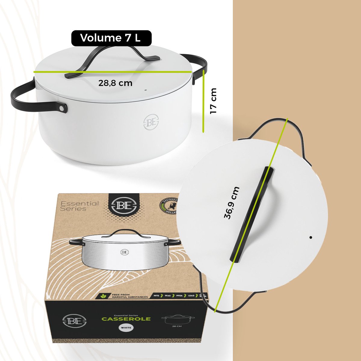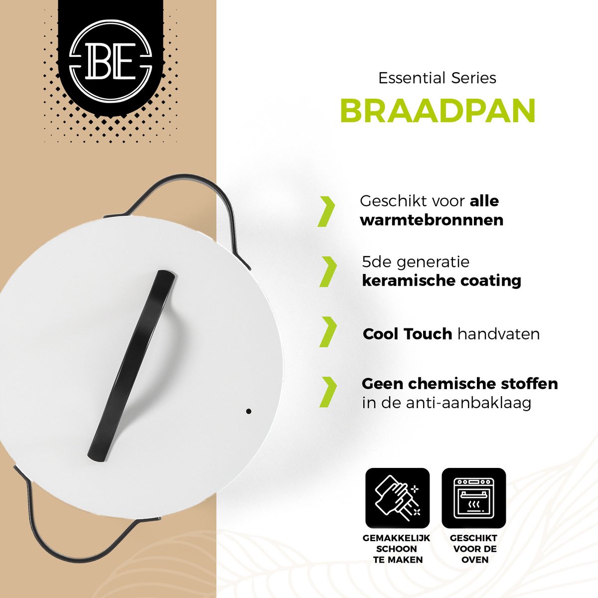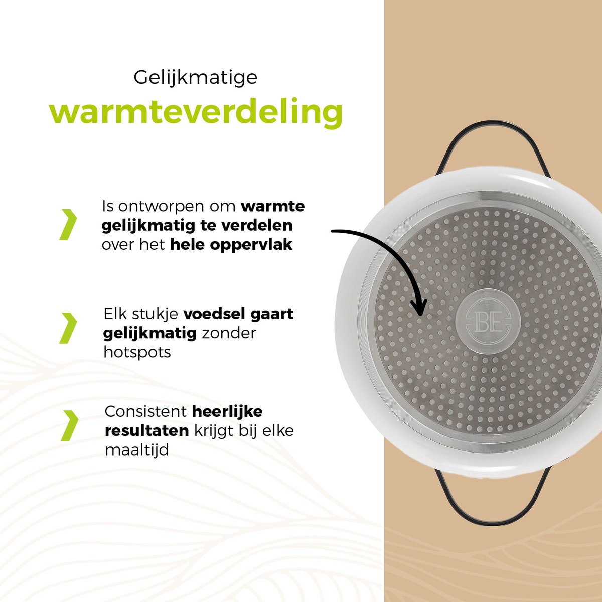 Overzicht:De BE Living 28 cm witte kookpan is een stijlvolle, PFAS-vrije braadpan voor de moderne Nederlandse keuken. Met een Ø 28 cm en een keramische anti-aanbaklaag van vijfde generatie is hij geschikt voor alle warmtebronnen, inclusief inductie.