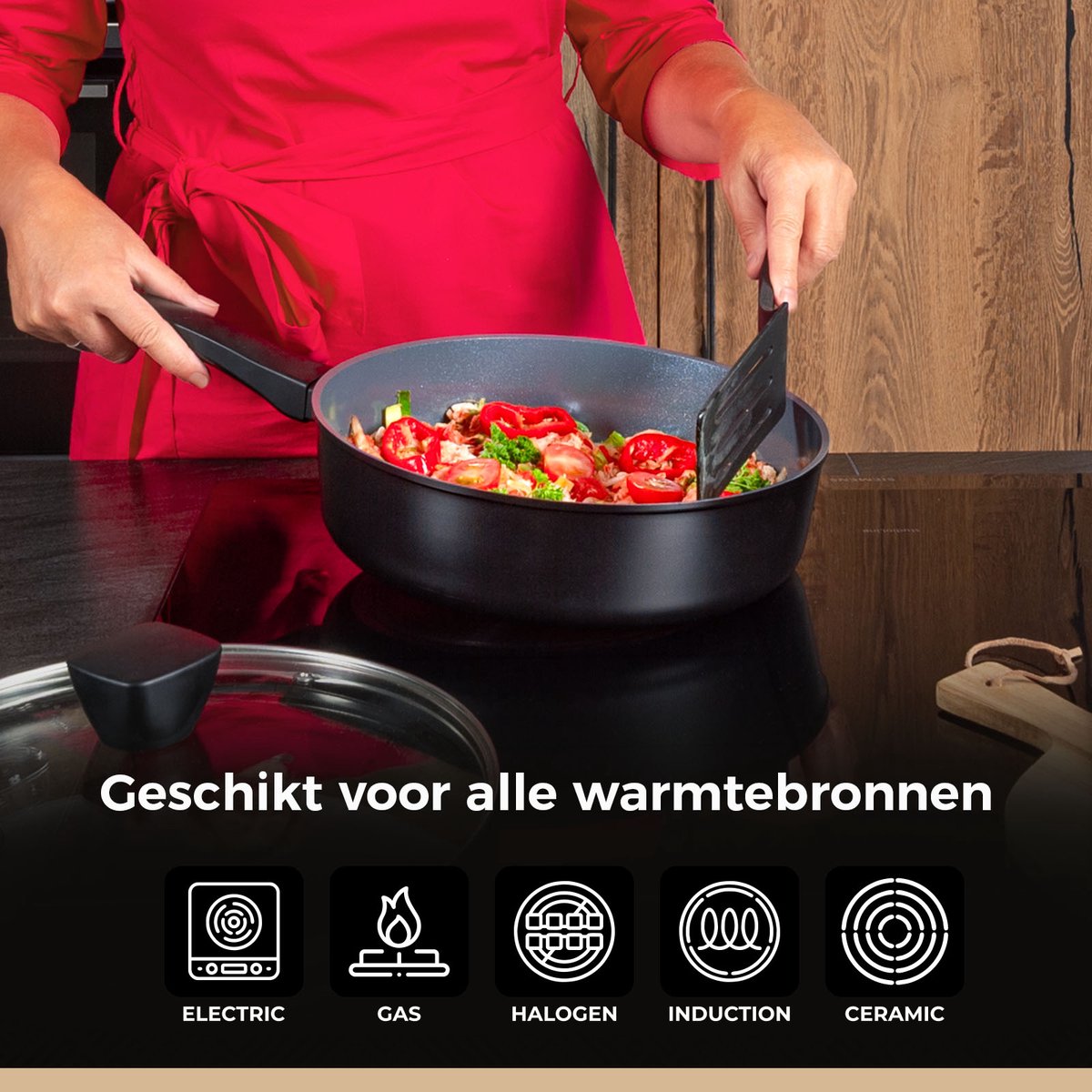 | Deksel meegeleverd, ideaal voor stoven en sudderen | Diameter 28 cm kan groot uitvallen voor kleine kookplaten |