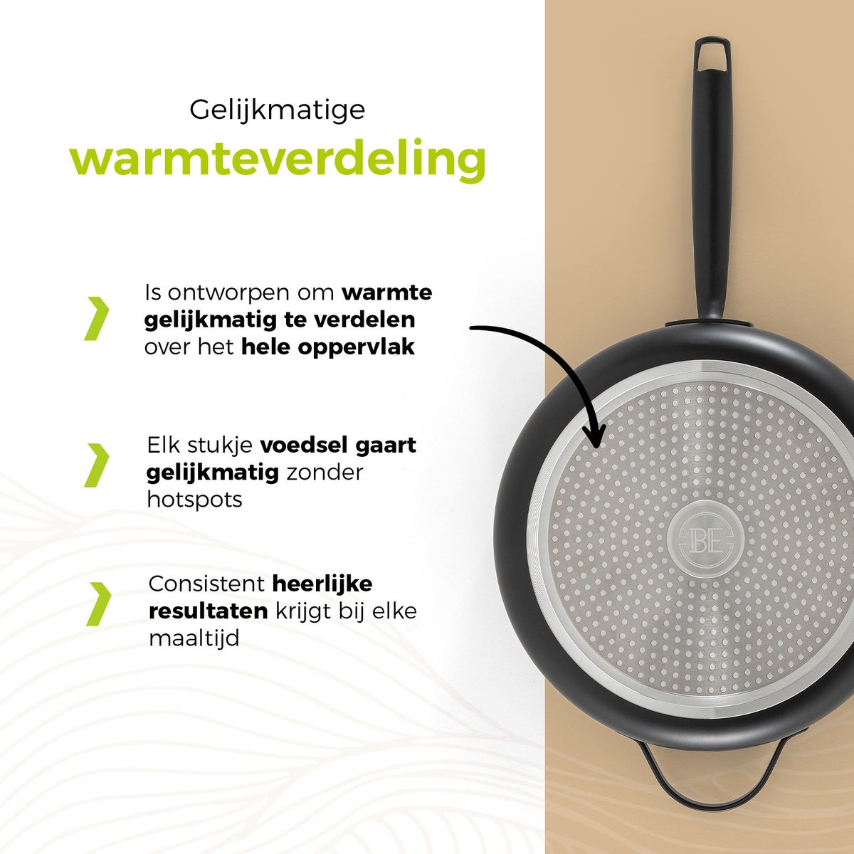 De pan is ontworpen voor egale warmte over het hele oppervlak, aldus de aanbieder. In de praktijk betekent dat minder risico op hotspots. Vooral bij gerechten die tegelijk verschillende temperaturen nodig hebben (bijvoorbeeld kipstukjes naast groente) of bij het inkoken van sauzen merk je voordeel: alles gaart consistenter en de kans op aanbakken aan één kant is kleiner.