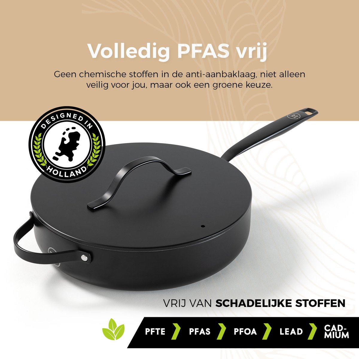 Volgens de aanbieder is de pan vrij van PFAS. Dat betekent dat de anti-aanbaklaag niet leunt op deze chemische stoffen die je soms in oudere of minder geavanceerde lagen aantrof. Voor huishoudens die bewust omgaan met materialen in de keuken is dat een geruststelling. Je kookt met een prettige anti-aanbakeigenschap, zonder dit specifieke type stof in de laag.