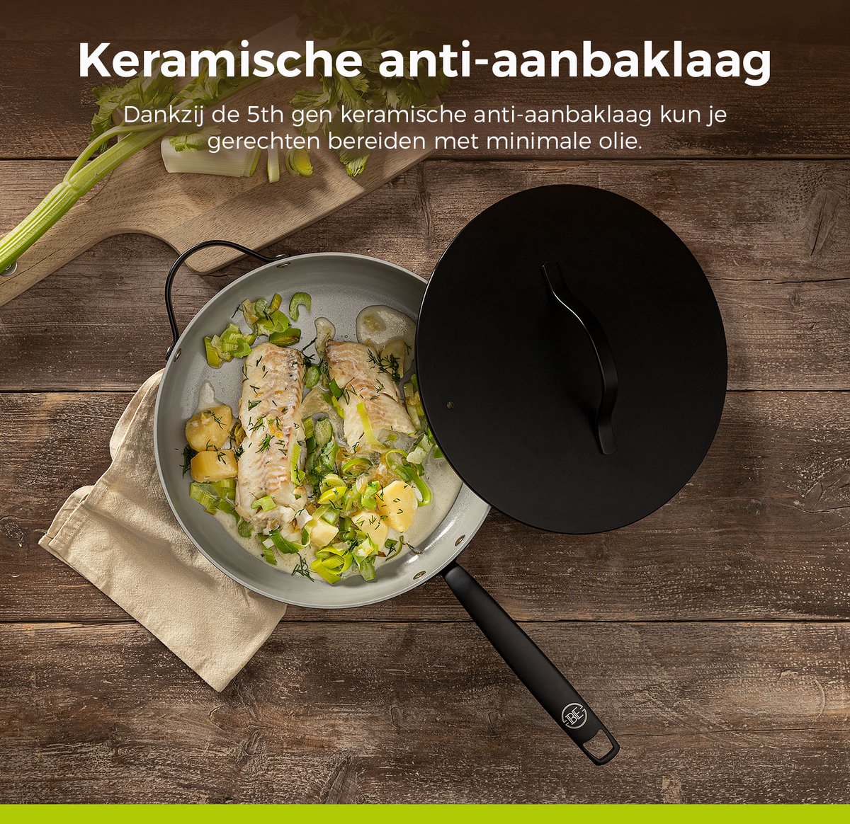De anti-aanbaklaag is keramisch en volgens de aanbieder van de vijfde generatie. Keramische lagen staan bekend om hun gladde oppervlak, het gebruik van minder olie en de snelle, directe respons op warmte. Het basismateriaal van de pan is niet gespecificeerd; wel is duidelijk dat de warmteverdeling volgens de fabrikant gelijkmatig is over het hele kookoppervlak. Dat helpt bij egale garing, zeker bij ingrediënten die gevoelig zijn voor hotspots, zoals vis of eieren.