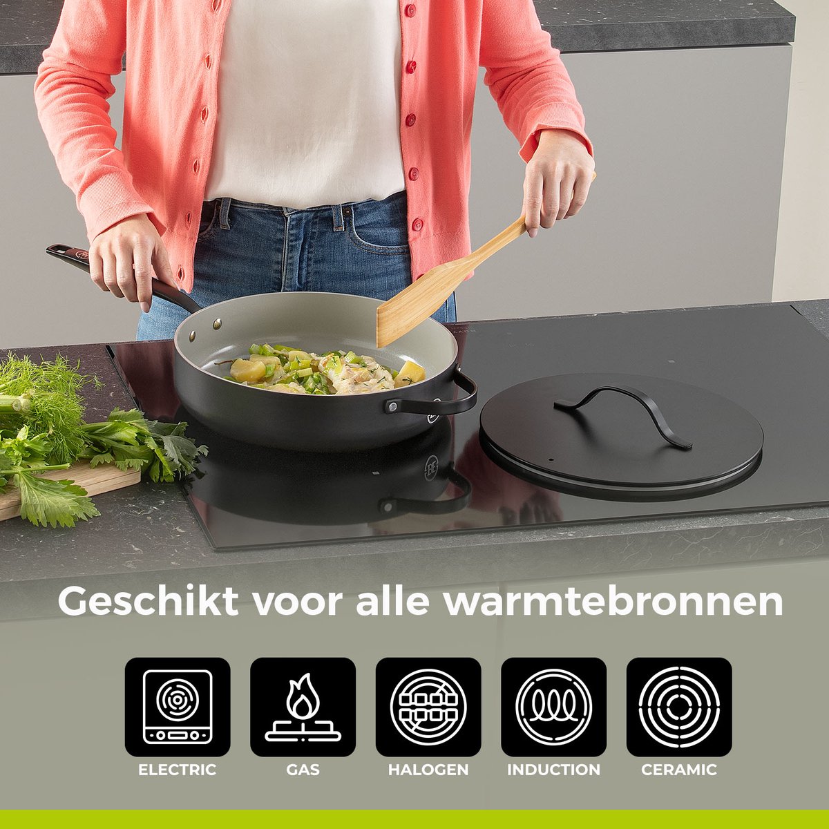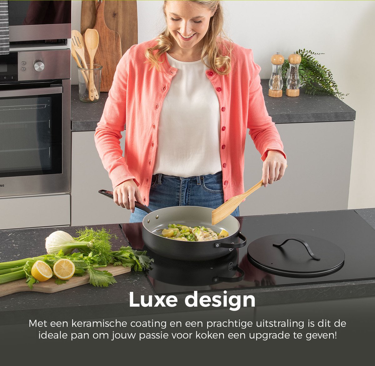 De BE Living hapjespan 28 cm is een royale, zwarte pan met keramische anti-aanbaklaag van de vijfde generatie, ontworpen voor dagelijks gemak en mooie resultaten. Hij is geschikt voor alle warmtebronnen, inclusief inductie, en vrij van PFAS, zodat je met een gerust hart kunt bakken, sauteren en sudderen. Denk aan risotto, kip in roomsaus, gegrilde groentes of éénpansgerechten: deze pan is gemaakt om veelzijdig te presteren.