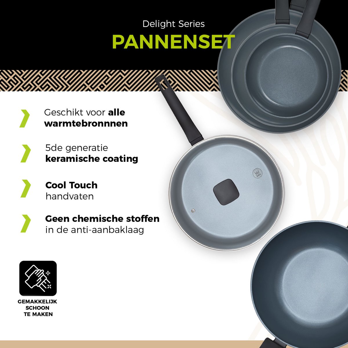 De BE Living Delight Series is een 5-delige pannenset ontworpen voor dagelijks gebruik en gevarieerd koken. De set bevat drie koekenpannen (Ø 20, 24 en 28 cm), een wokpan Ø 32 cm en een hapjespan Ø 28 cm met deksel. Volgens de productomschrijving zijn de pannen voorzien van een keramische anti-aanbaklaag, cool touch handvatten en een zwarte afwerking — en ze zouden geschikt zijn voor alle warmtebronnen, inclusief inductie.
