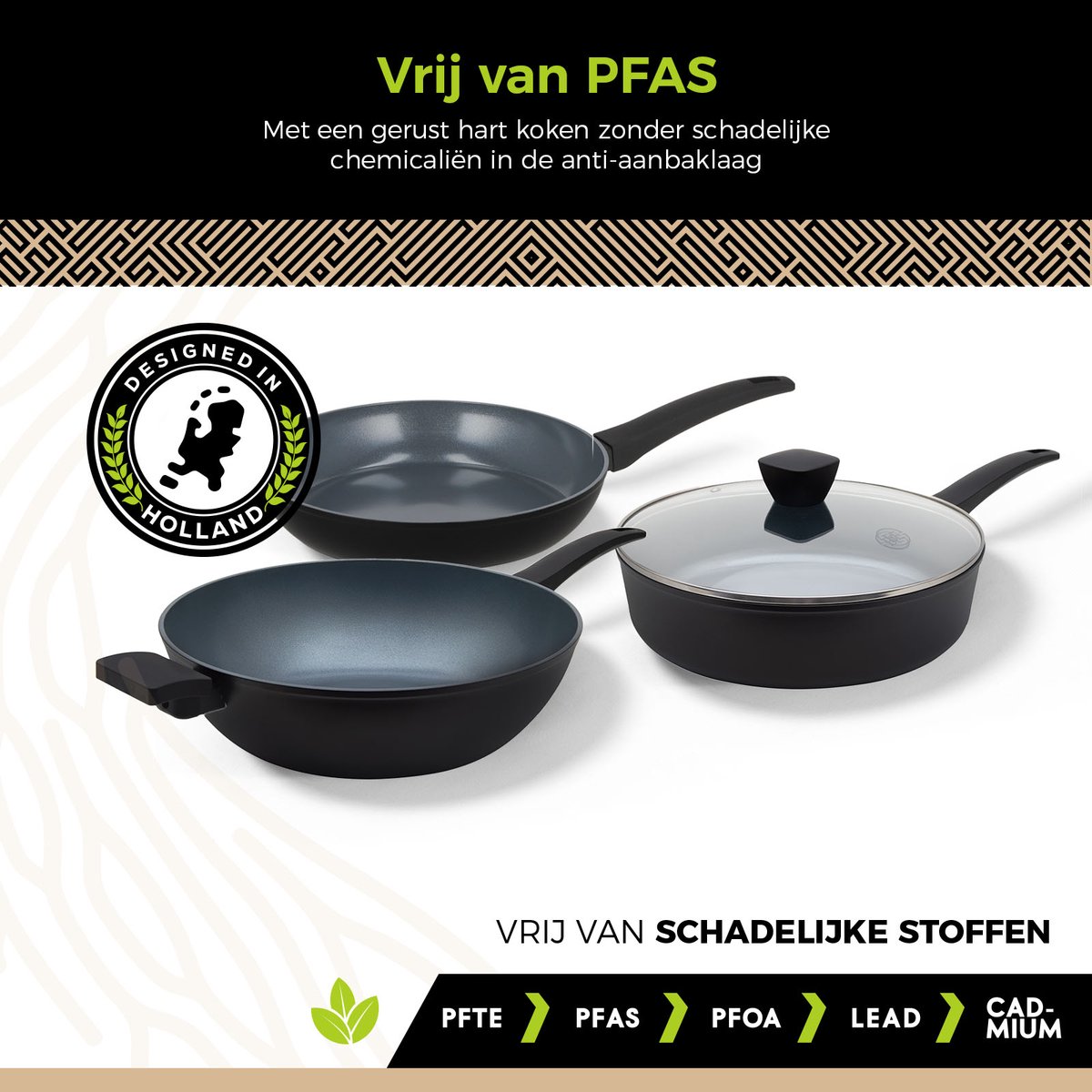 De pannen zijn 100% PFAS-vrij volgens de producttekst. Dat betekent dat er geen per- en polyfluoralkylstoffen in de coating gebruikt zouden worden, wat voor veel kopers een belangrijke gezondheids- en milieubelofte is. Waar dit helpt: als je bewust wilt koken zonder mogelijke schadelijke fluorverbindingen in de anti-aanbaklaag, is dit een reden om voor deze set te kiezen.