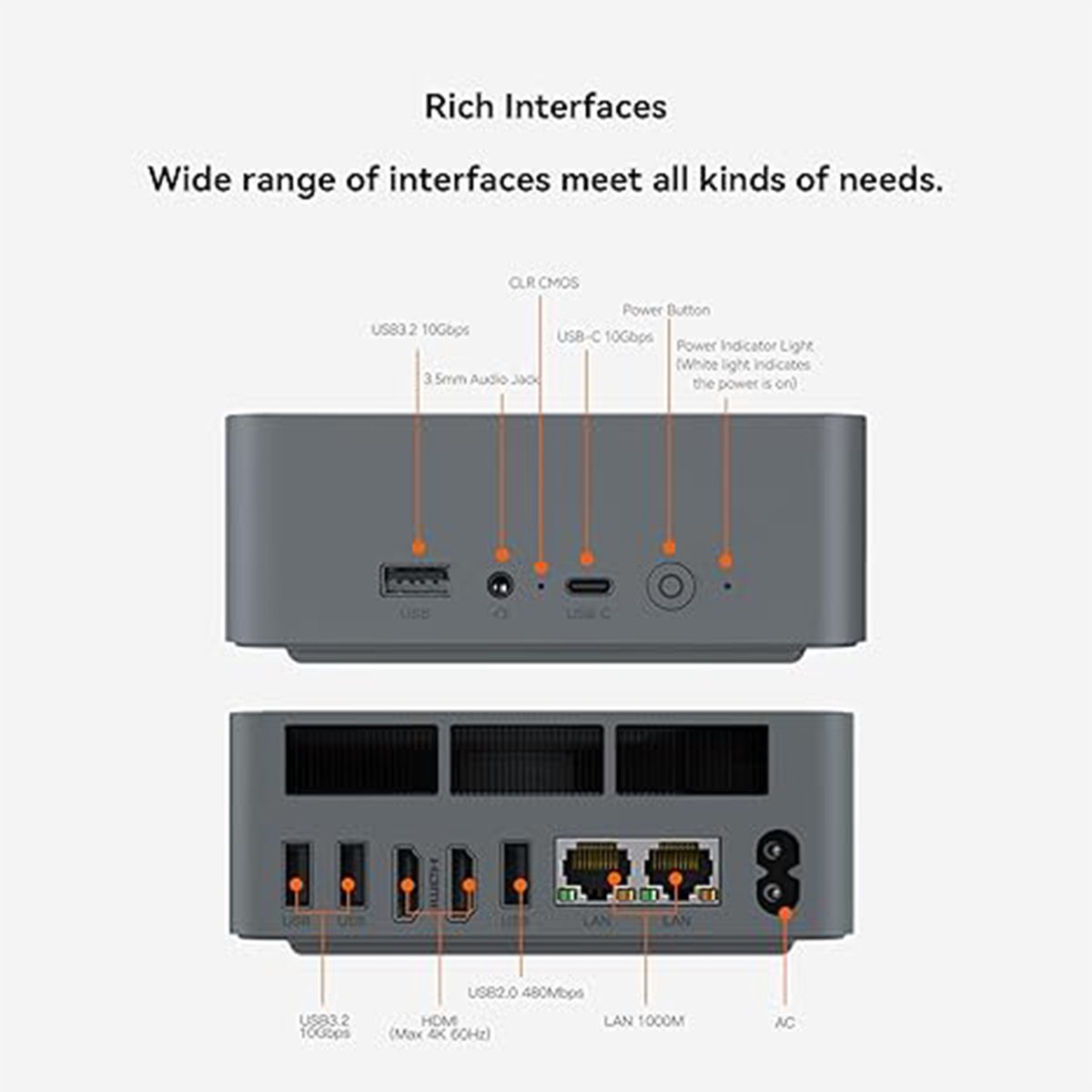 Je krijgt een breed palet aan aansluitingen: 1x usb type‑c (10 Gbps), 3x usb 3.2 (10 Gbps), 1x usb 2.0 (480 Mbps), 2x HDMI 2.0 4K@60 Hz, 1x 3,5 mm microfoonaansluiting, DC‑in, plus knoppen voor aan/uit, reset en RTC. Dat maakt de opstelling overzichtelijk: één kabel naar de monitor, een tweede naar een capture‑ of dock‑oplossing, en genoeg snellere poorten voor externe SSD’s.