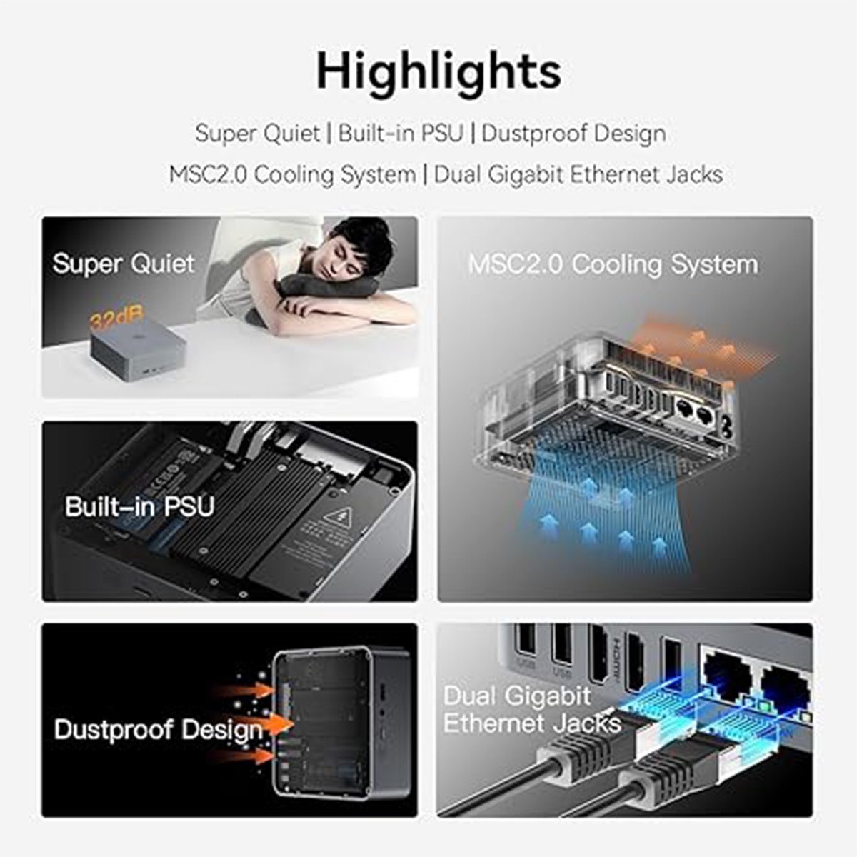 Het vernieuwde koelsysteem houdt de temperatuur onder controle en werkt energiezuinig. In de praktijk hoor je vooral een zachte luchtstroom bij belasting, terwijl de behuizing koel blijft. Houd de luchtkanalen vrij en plaats de mini‑pc niet klem in een afgesloten kast; zo behoud je de beste prestaties en levensduur.