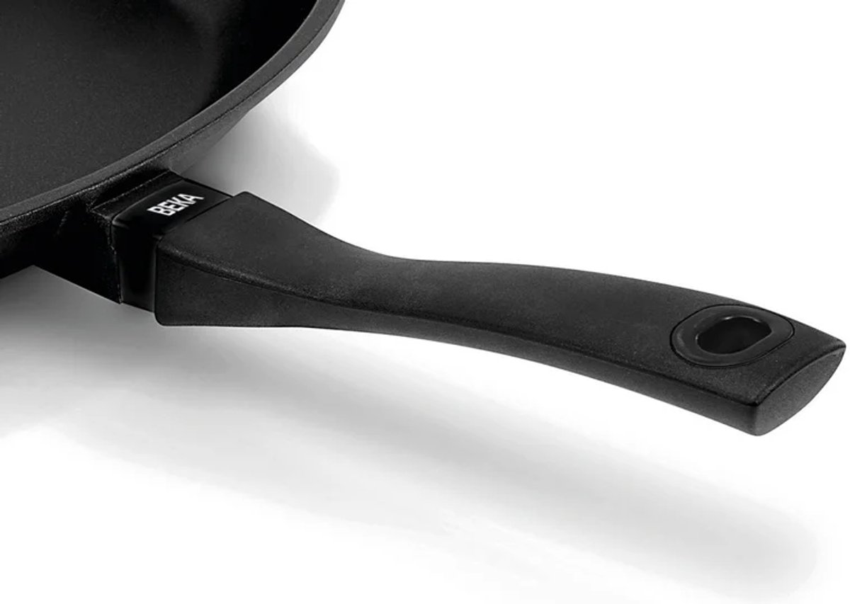 De handgreep is van hittebestendig bakeliet, wat grip en comfort biedt tijdens het hanteren. Voor dagelijks gebruik voelt de pan licht aan doordat het aluminium de pan niet onnodig zwaar maakt.