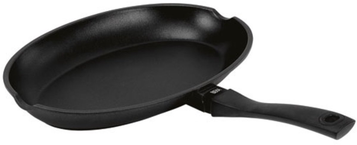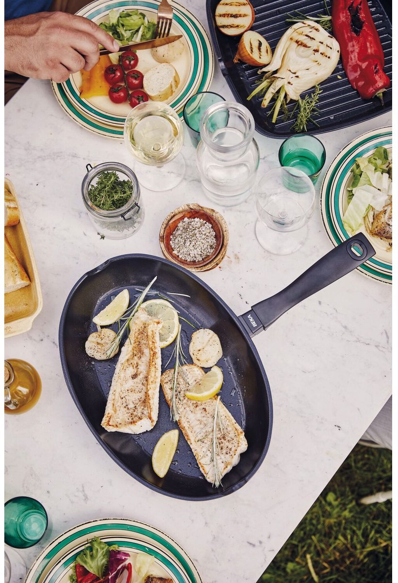 De ovale vorm is praktisch: je legt zelfs grotere vissen in één keer in de pan zonder te hoeven snijden of dubbel leggen. Het all-black uiterlijk geeft de pan een strakke, moderne uitstraling die naadloos aansluit bij veel keukenstijlen. De twee geïntegreerde giettuiten zijn slim geplaatst zodat zowel rechts- als linkshandigen gemakkelijk kunnen afgieten zonder morsen.
