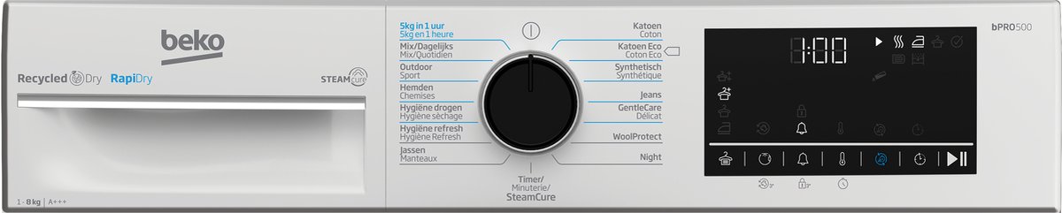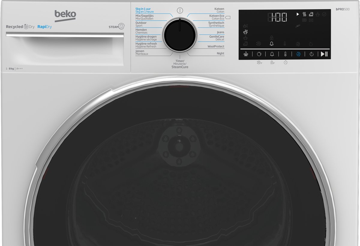 - Snel of spaarzaam: RapiDry is je redding als de tijd dringt (volgens Beko: 5 kg in 1 uur; volle belading in 2 uur). Heb je géén haast, kies dan de zuinige modus of Katoen Eco om het lage verbruik van de A+++ klasse optimaal te benutten. Zo stem je snelheid en energieverbruik af op je dagplanning.