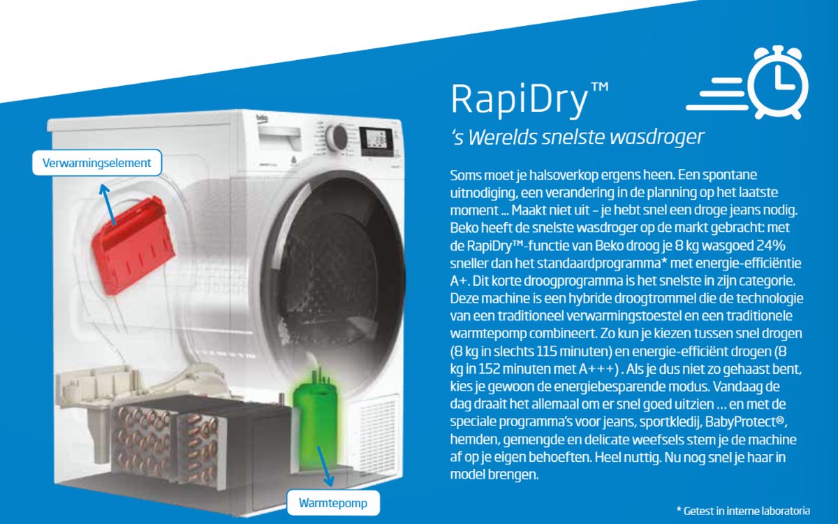 | RapiDry voor snel drogen bij tijdsdruk (1 uur halve lading, 2 uur volle lading volgens Beko) | Geluidsniveau 63 dBA is hoorbaar in open ruimtes, ondanks stil programma |