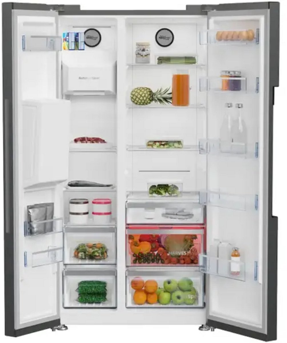 De Beko B7RGNE665ZDS Amerikaanse koelkast is een ruime, dubbeldeurs koel-vriescombinatie met vaste water- en ijsdispenser, NoFrost en slimme vershoudtechnologieën. Met 571 liter netto inhoud, een stille invertercompressor en praktische functies als vakantiemodus en open-deur-alarm is het een serieuze allrounder voor gezinnen en thuiskoks.
