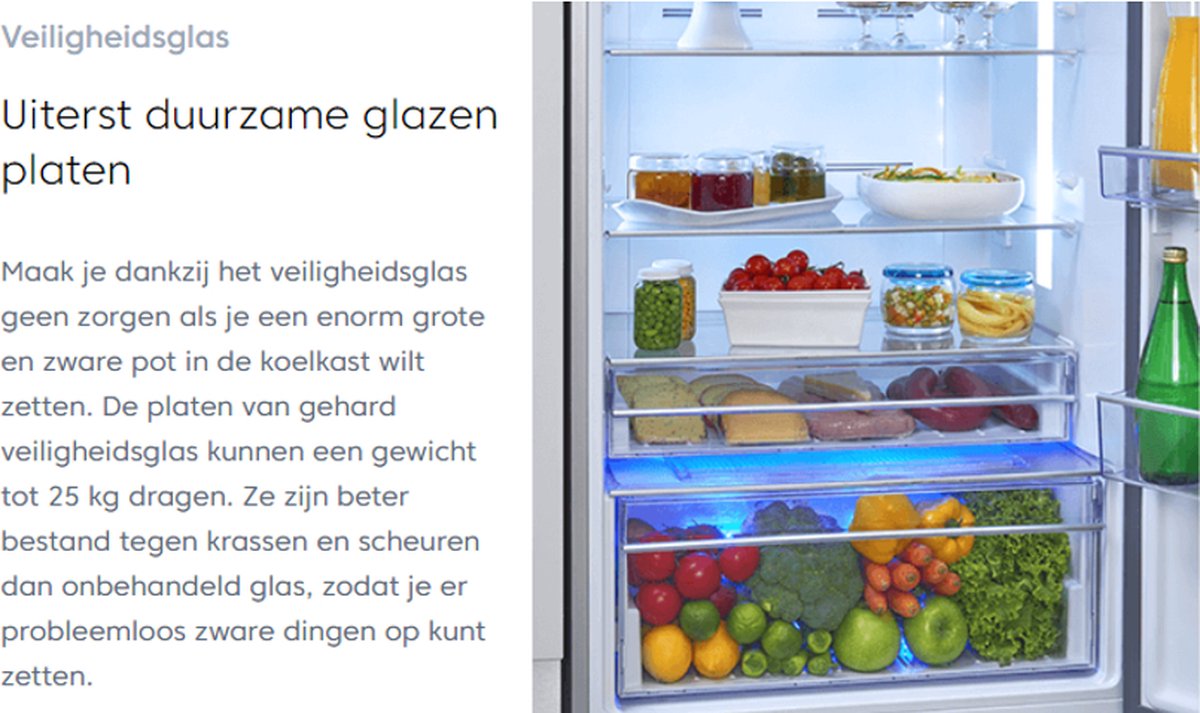 De Beko RSSA290M41WN gebruikt veiligheidsglas met hoge belastbaarheid. Voordelen: