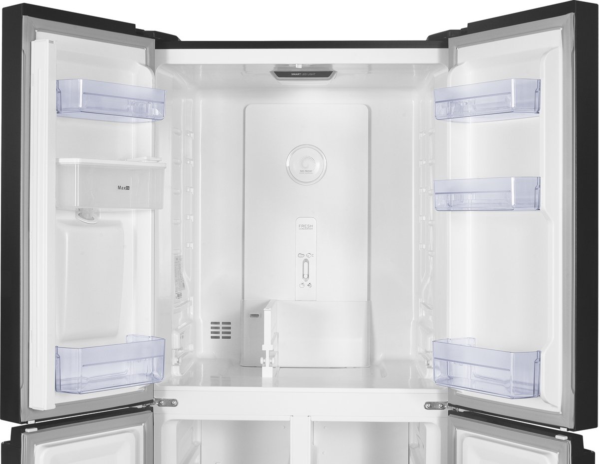 Flexibele indeling met verstelbare glasplateaus, vier deurvakken en zes transparante vrieslades. | Geen melding van water- of ijsdispenser; wie daarop mikt, moet verder zoeken. |