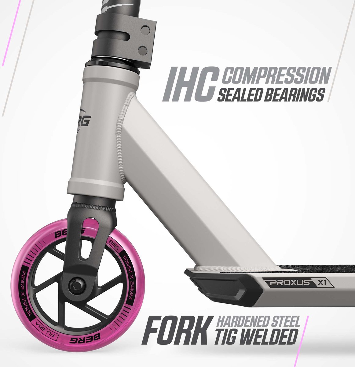 De BERG Proxus X1 is een stuntstep ontworpen voor jonge rijders die hun tricks willen verbeteren en door willen groeien van beginner naar gevorderde. De step combineert een licht totaalgewicht met onderdelen die volgens de omschrijving uit hoogwaardige materialen bestaan, met als doel controle en duurzaam gebruik tijdens stunts en freeride-sessies.