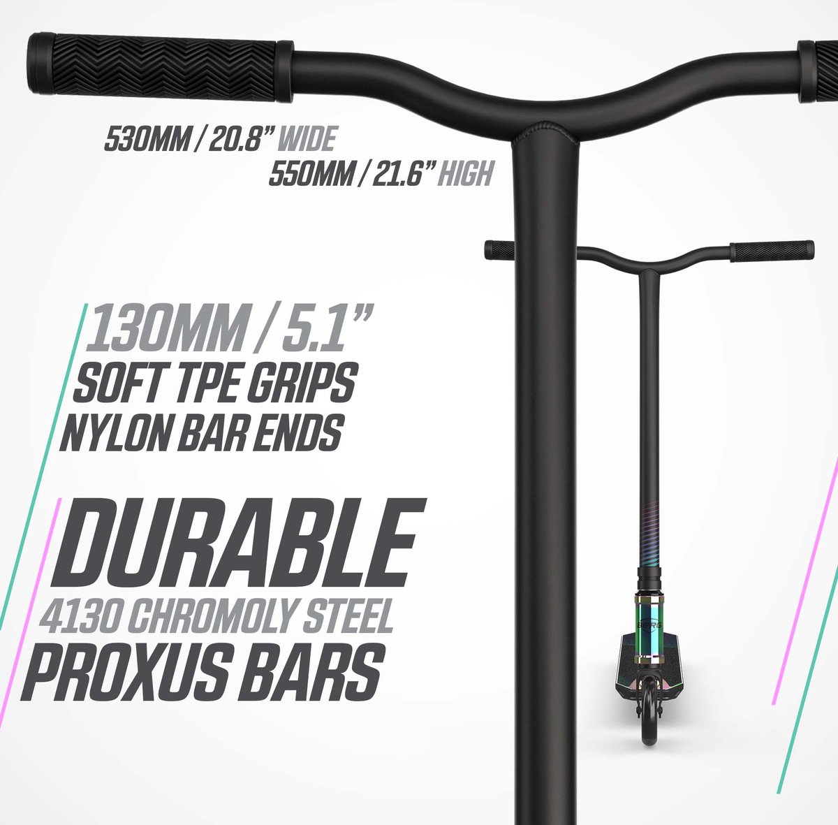 De Proxus X1 heeft een vrij klassieke freestyle-opbouw met een Y-vormig stuur en een deck dat relatief breed en kort is. Het stuur is gemaakt van Chromoly Staal 4130, een materiaal dat veel wordt gebruikt in freestyle-onderdelen vanwege de hoge sterkte-gewichtsverhouding. De barbreedte van 530 mm en barhoogte van 550 mm geven een stabiele stuurpositie die geschikt is voor zowel straattricks als parkgebruik.