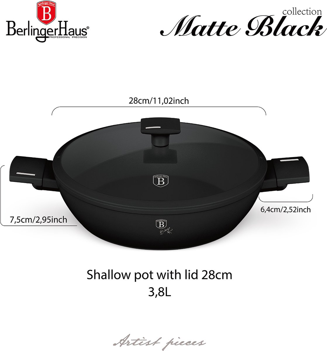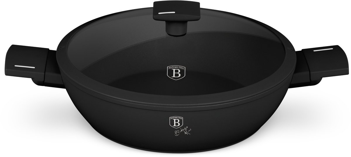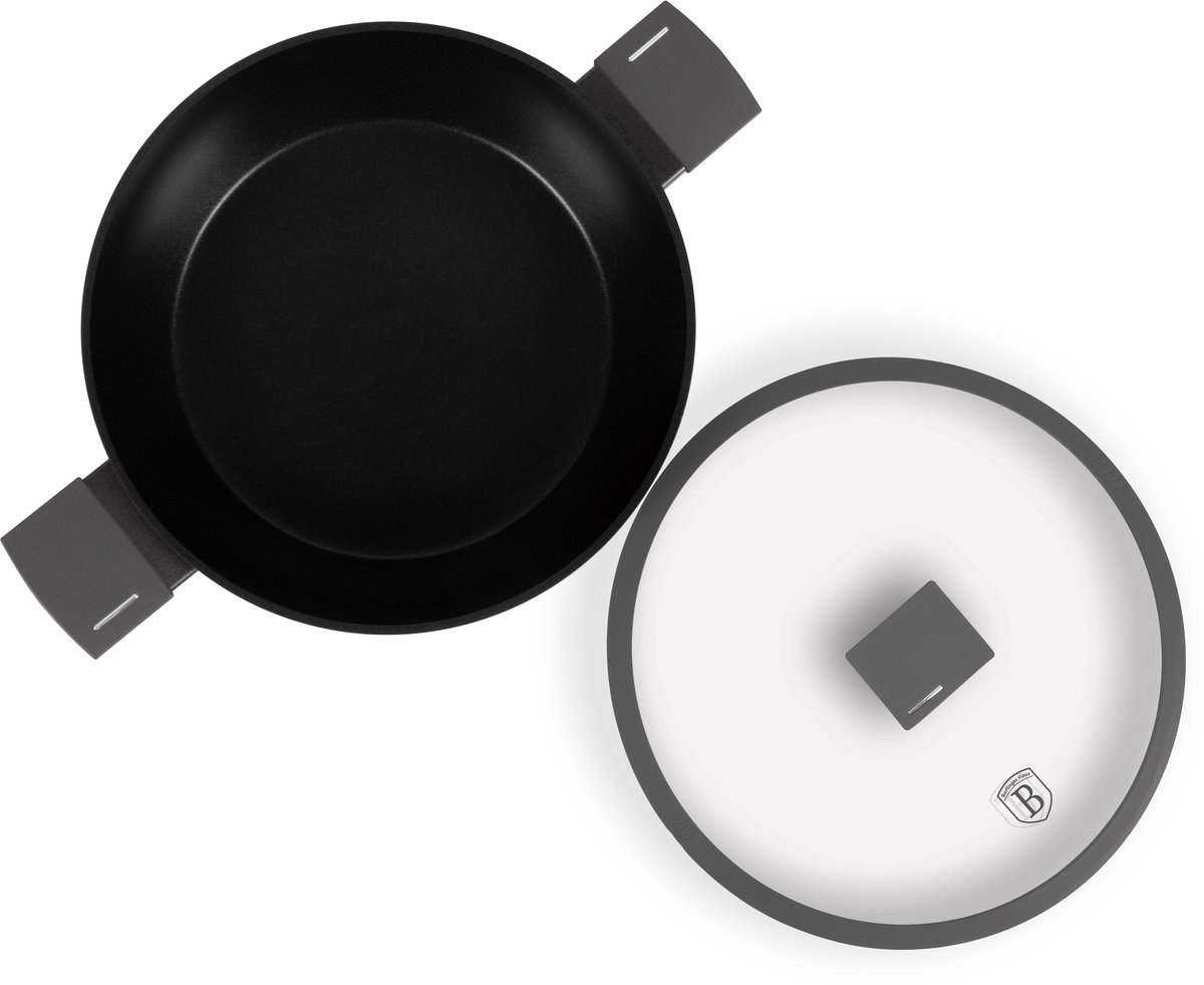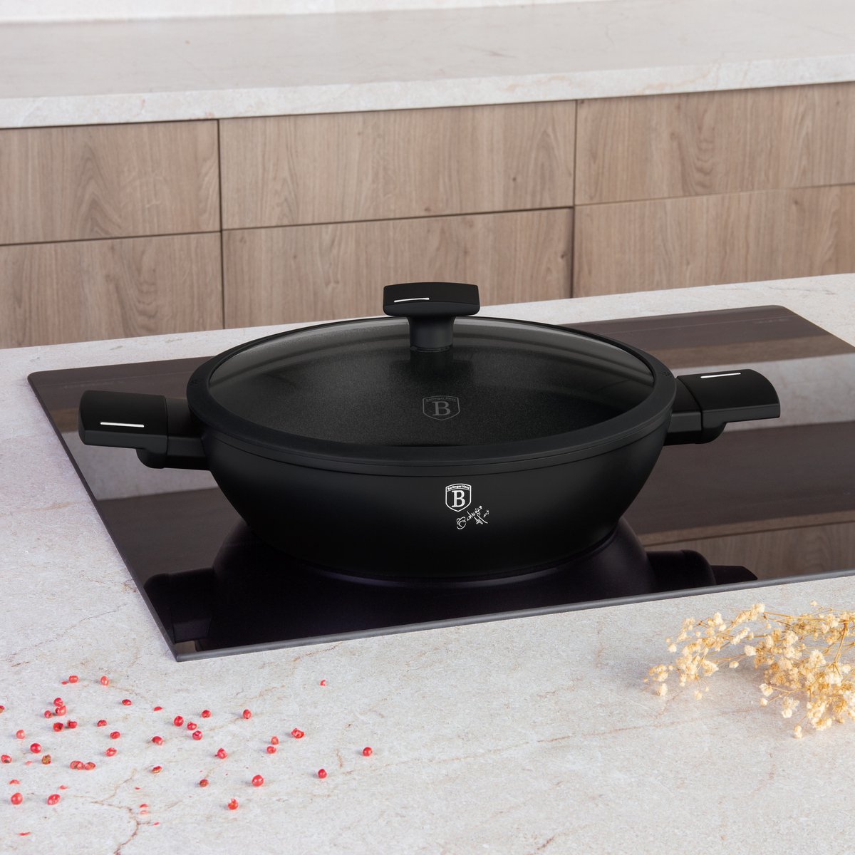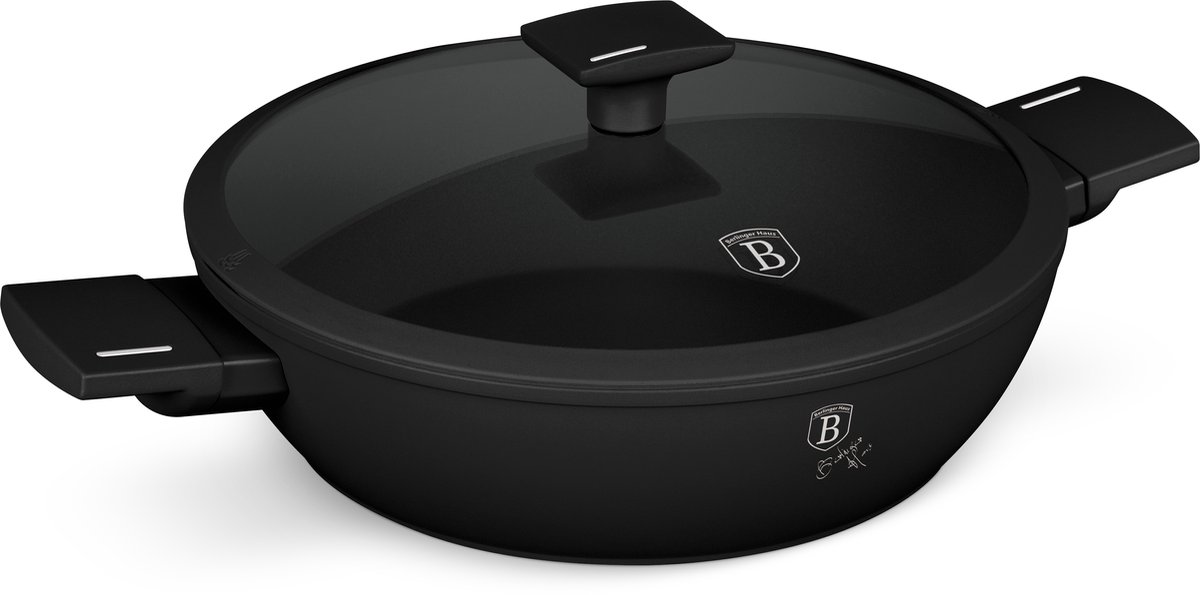 De Berlinger Haus Lage Kookpan is een brede, lage pan met deksel van 28 cm doorsnede en 7,5 cm hoogte (3,8 liter), gemaakt van gesmeed aluminium en voorzien van een driedubbele TitanPro-antiaanbaklaag. Hij is ontworpen voor dagelijks gemak: snel warm, gelijkmatig garend, en eenvoudig schoon te maken. Dankzij de matte afwerking en het minimalistische ontwerp staat hij ook nog eens fraai op het fornuis.