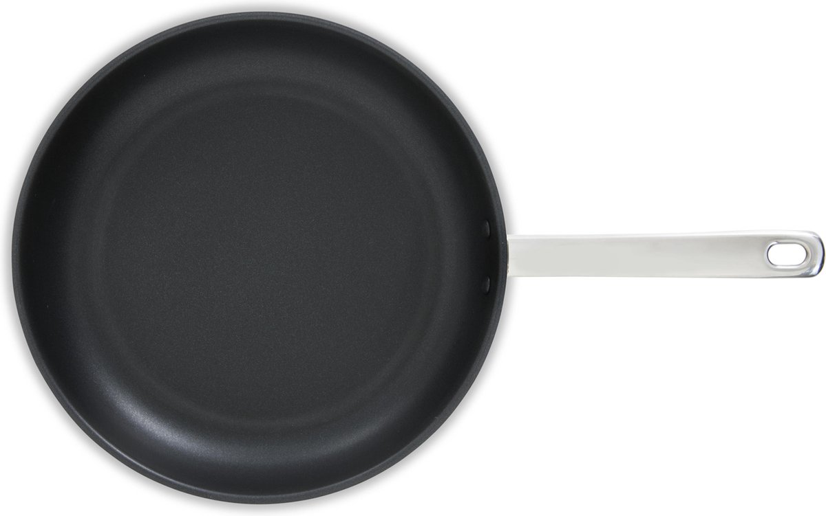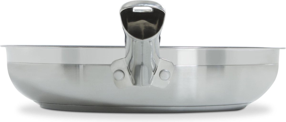 De pan heeft een sandwichbodem: meerdere lagen materiaal die samen zorgen voor een efficiëntere warmteverdeling en -retentie. Dat helpt bij gelijkmatig bruiningsresultaat en voorkomt hotspots op het fornuis (bron: listing, checked 2025).