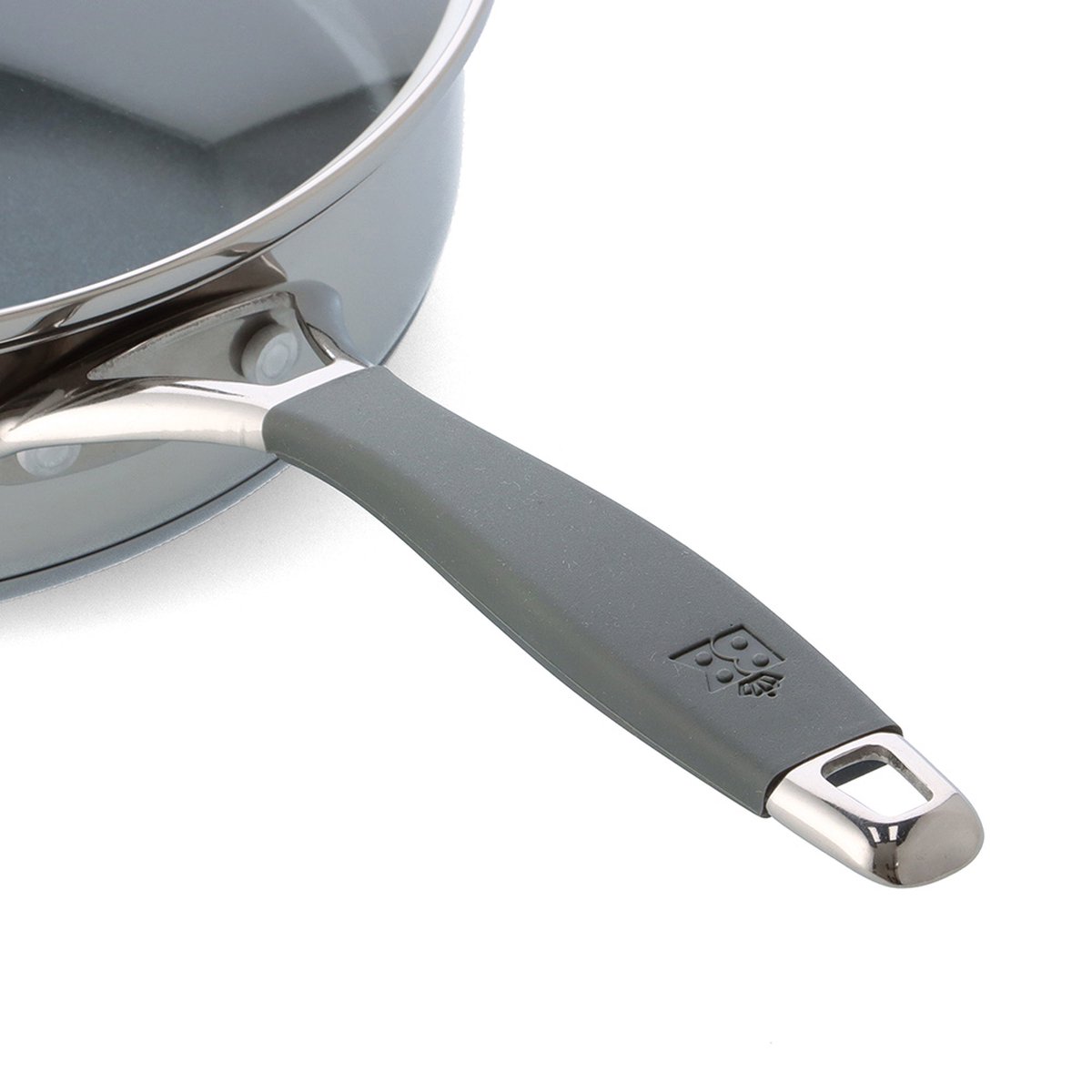 De roestvrijstalen handgrepen zijn afgewerkt met siliconen, wat de grip verbetert en het hanteren veiliger en comfortabeler maakt. Dit helpt bij het verplaatsen van zwaardere gevulde pannen.