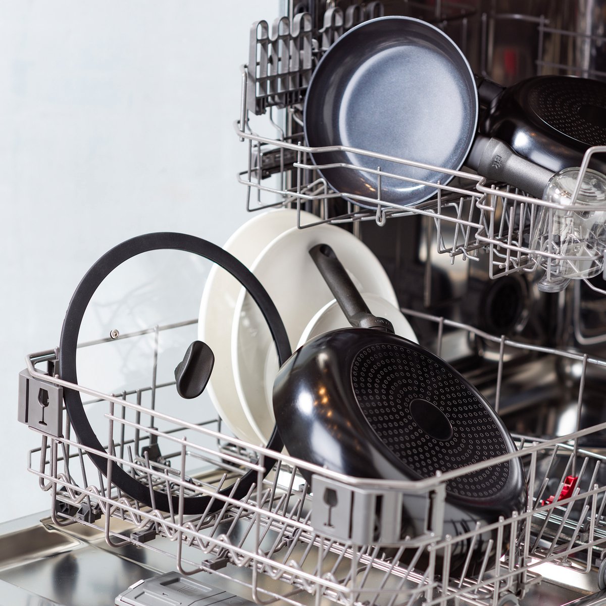 - Handwas met zachte spons en warm zeepsop wordt aanbevolen; vaatwastabletten kunnen na verloop van tijd de antiaanbaklaag aantasten.