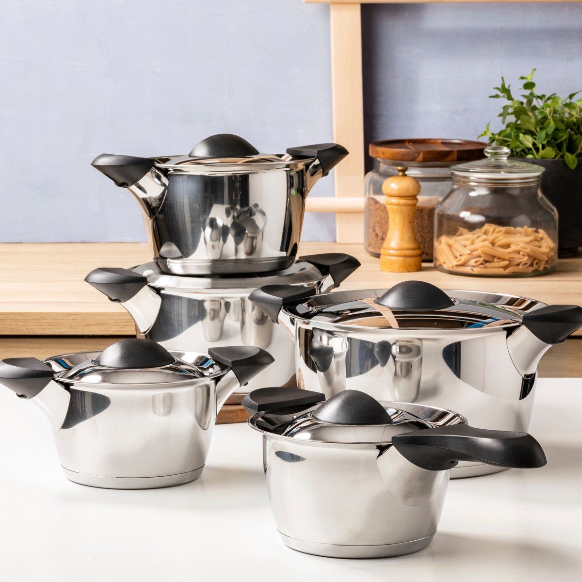 De BK Q-linair Classic Pottenset is een set van vijf roestvrijstalen pannen met een hoogglans gepolijste buitenkant. Deze set richt zich op thuiskoks die op zoek zijn naar een degelijke, tijdloze pottenset voor uiteenlopende kooktaken — van sudderen en koken tot sauzen bereiden.