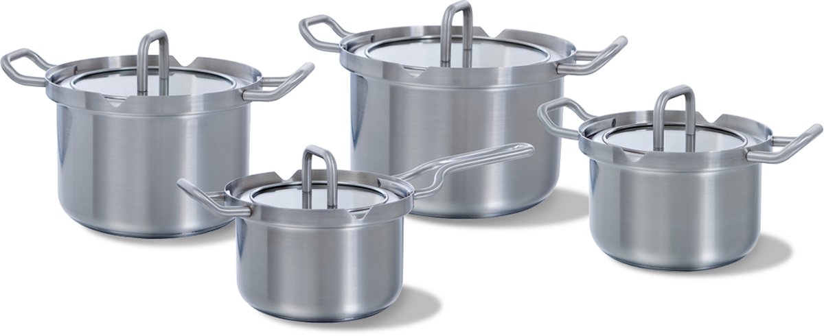 Wat een fijne pannenset! Elke pan heeft een maatverdeling, wat erg handig is. De deksel kun je een kwartslag draaien zodat hij tijdens het afgieten niet losschiet, en dat belemmert het afgieten niet. Doordat de deksel deels van glas is, heb je goed zicht op het kookproces en hoef je niet steeds deksel op te tillen — dat bespaart energie. De handvatten worden nauwelijks heet als je de juiste brander gebruikt. De pannen stapelen mooi in elkaar en de deksels nemen weinig ruimte in in de vaatwasser. Het eten komt snel aan de kook. Ik ben er heel tevreden mee en kan deze set zeker aanraden.