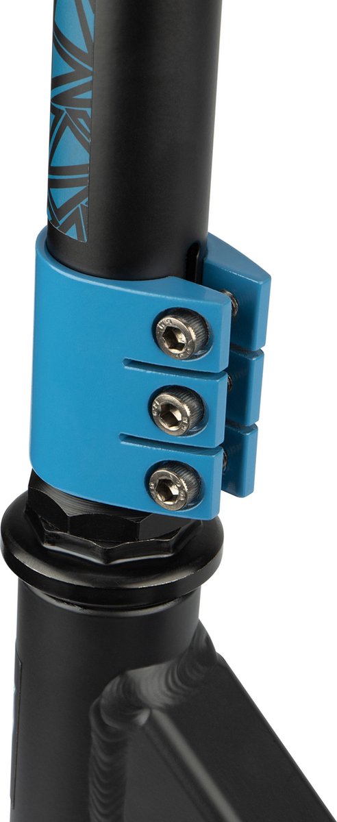 Het stalen T-bar stuur is ontworpen voor stevigheid en gecontroleerde manoeuvres. De triple stuurklem zorgt voor extra klemkracht, waardoor de stuurstang niet gaat draaien bij harde tricks of stoten — belangrijk bij powerheelgrinds en rotaties.