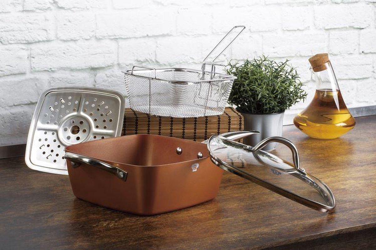 Deze 4-delige keukenset is een compacte, multifunctionele pannenset met een diepe vierkante pan, een frituurmandje, een geperforeerde plaat voor stomen en een glazen deksel. Het is ontworpen voor mensen die snel willen schakelen tussen bakken, frituren, stomen en ovengerechten zonder veel losse onderdelen te gebruiken.