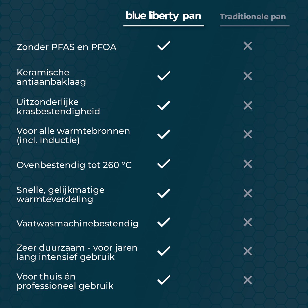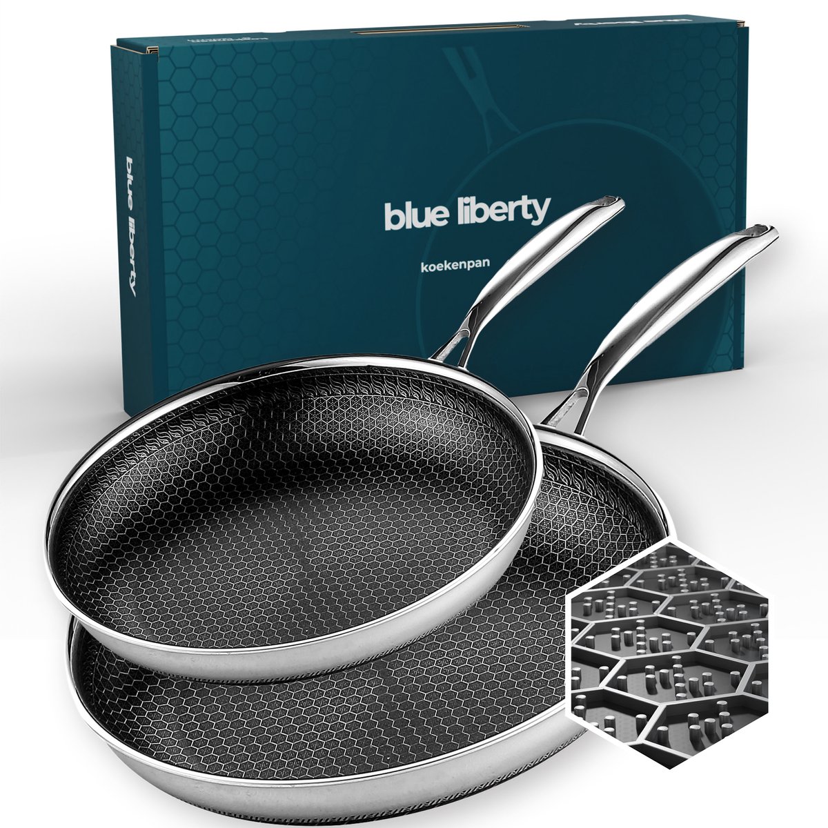 De Blue Liberty Hybrid Pannenset is een set van twee koekenpannen die roestvrij staal combineert met een keramische, hybride honingraat-anti-aanbaklaag. De set richt zich op thuiskoks die zoeken naar een duurzame, krasvaste pan waarmee je met weinig olie gezond kunt bakken — geschikt voor alle warmtebronnen, inclusief inductie en de oven.