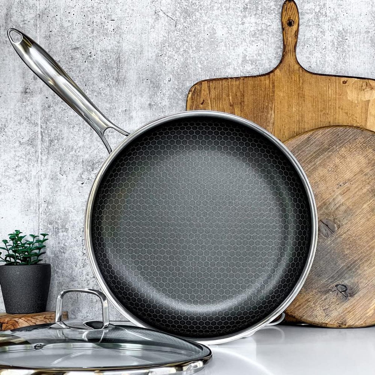 De pannen combineren roestvrij staal met een aluminium kern (Tri-Ply constructie) en een hybride keramische anti-aanbaklaag in honingraatpatroon. De buitenkant is RVS, wat bijdraagt aan stevigheid en een strakke uitstraling die in veel keukens past. Dankzij de aluminium kern wordt warmte snel en gelijkmatig verdeeld; dat voorkomt hotspots en zorgt voor een consistente baktemperatuur over het oppervlak.