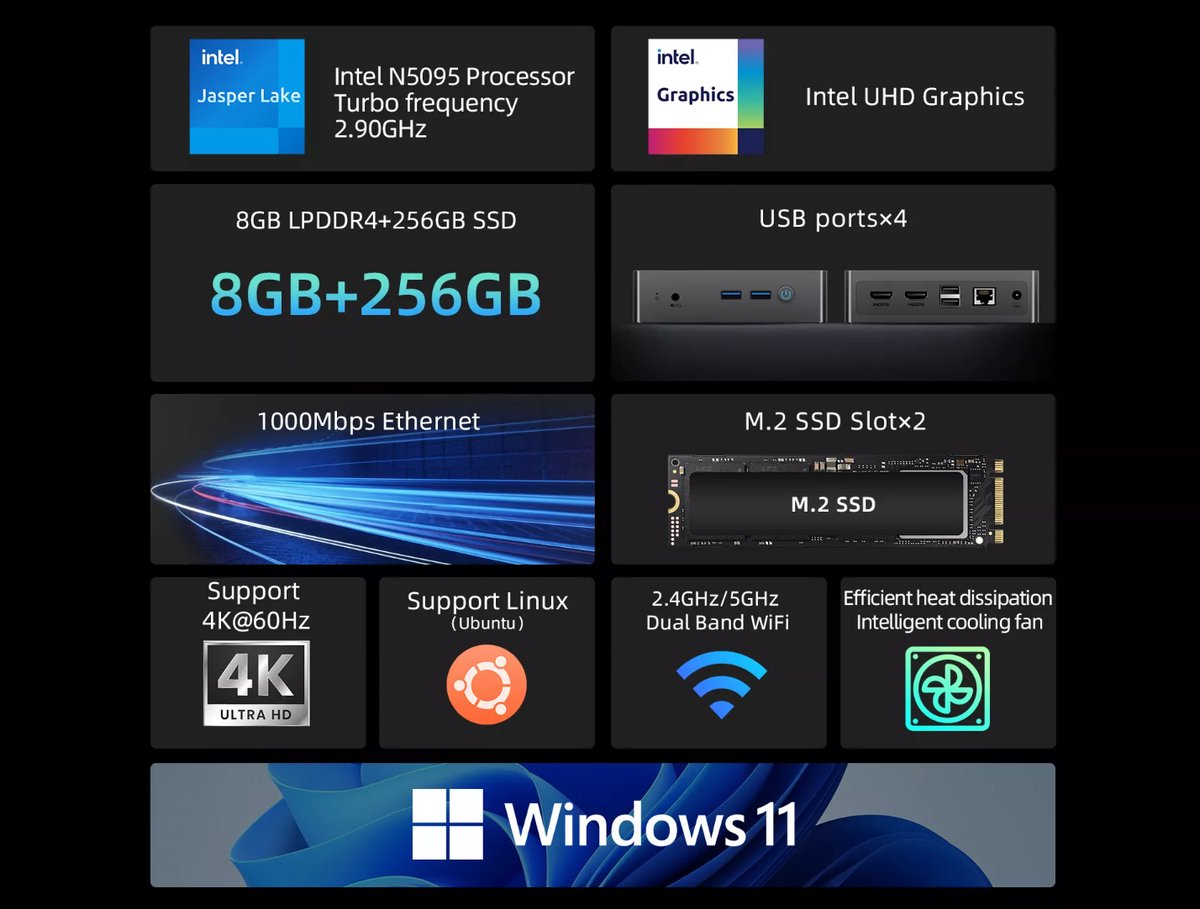 Compacte mini-pc die zeer eenvoudig te installeren is. Voldoet volledig aan de verwachtingen en werkt probleemloos met een draadloze muis en toetsenbord. Windows 11 draait er vlekkeloos op. Al met al een uitstekende aankoop.